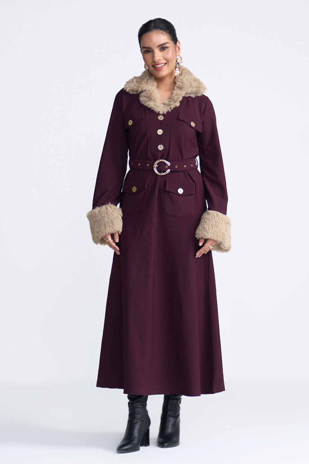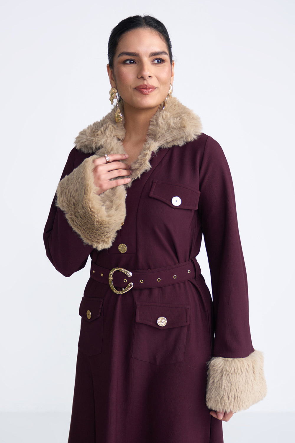 The Bianca dress in maroon rib fabric has a beautiful stretch, touch and feel to it. We've add fur trimmings with glamorous buttons to create an alluring evening look.