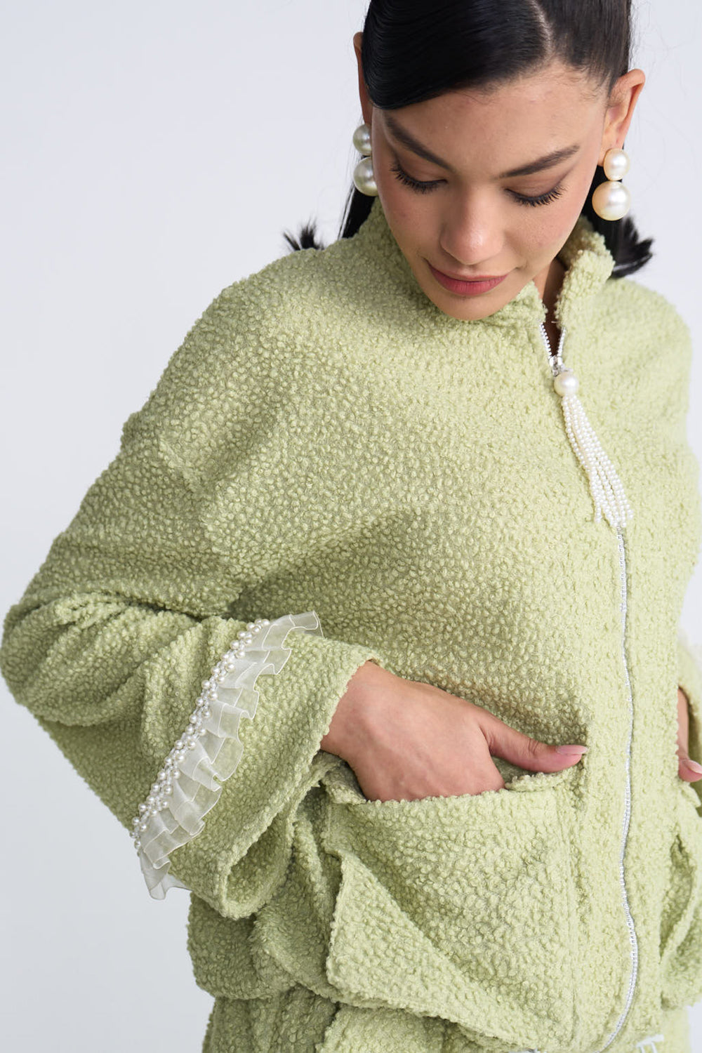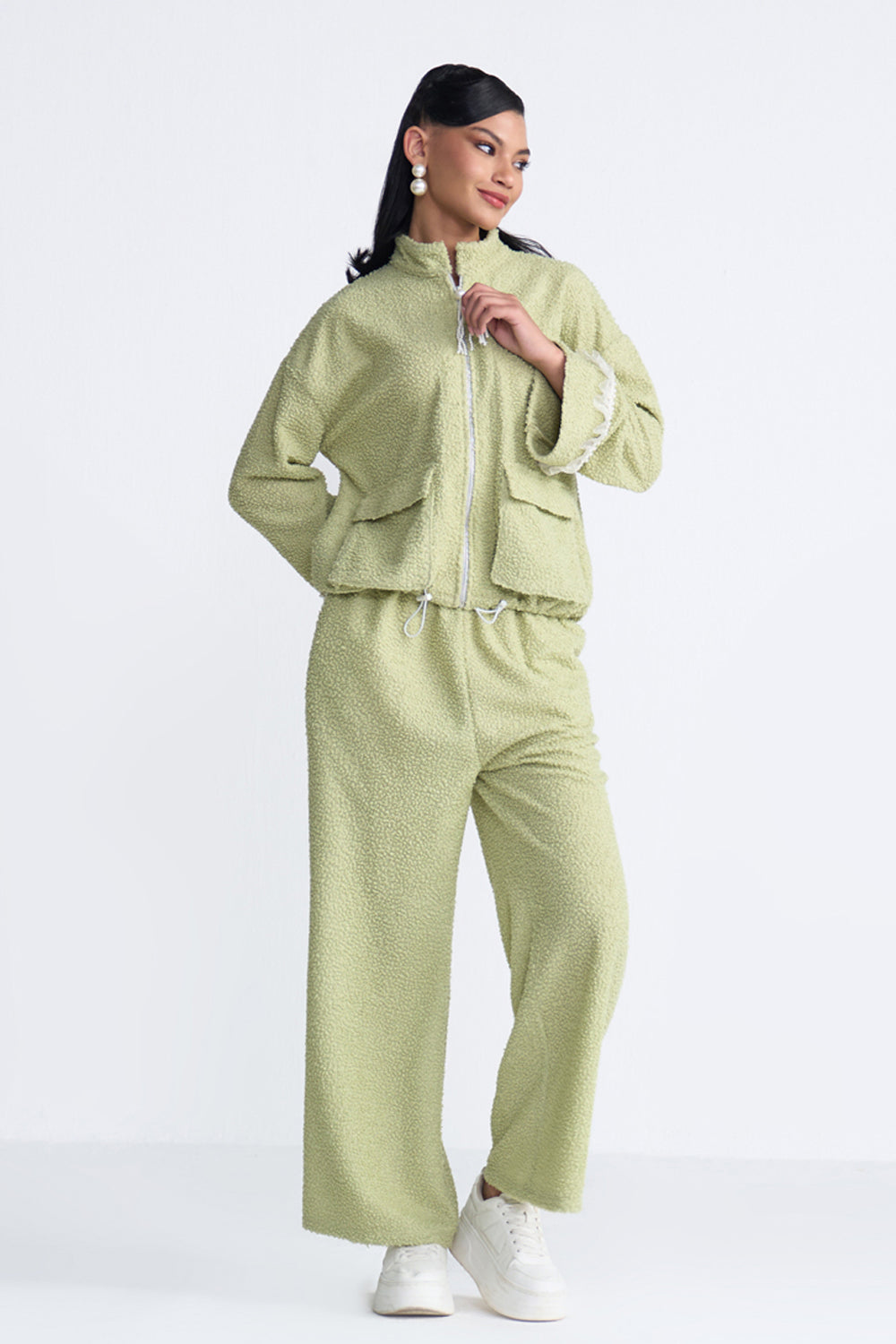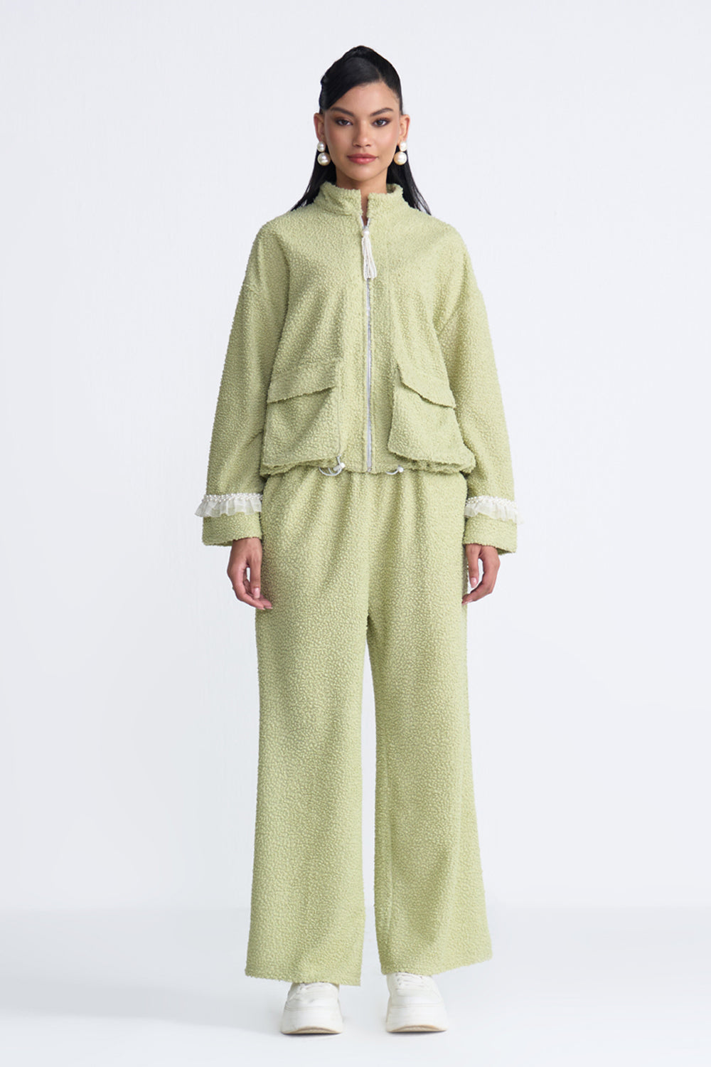 Elevated athleisure in our fern coord that is as stylish as it is comfortable.The delicate lace and pearls detailing makes it the perfect outfit to take you from picnic lunches to airport looks.