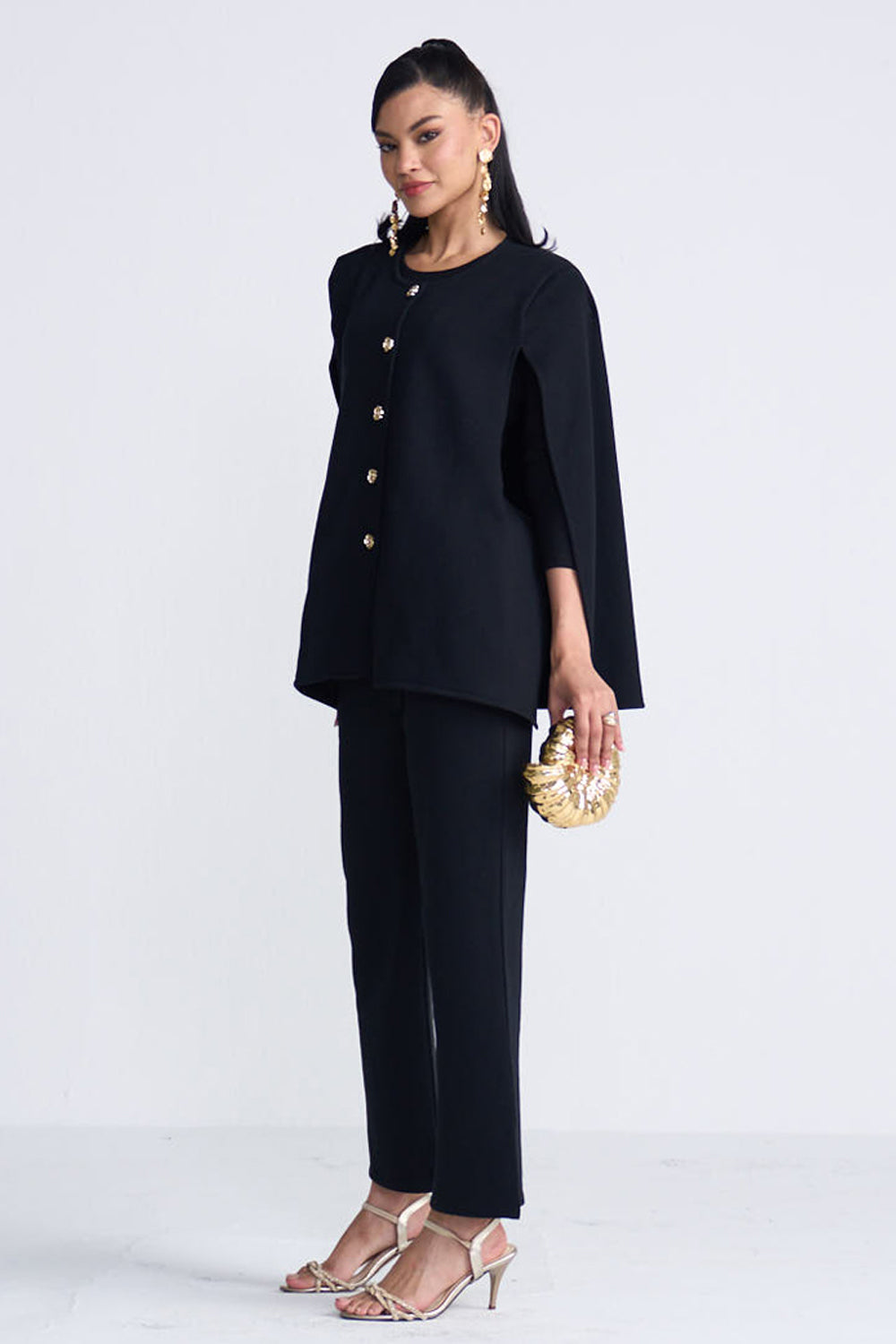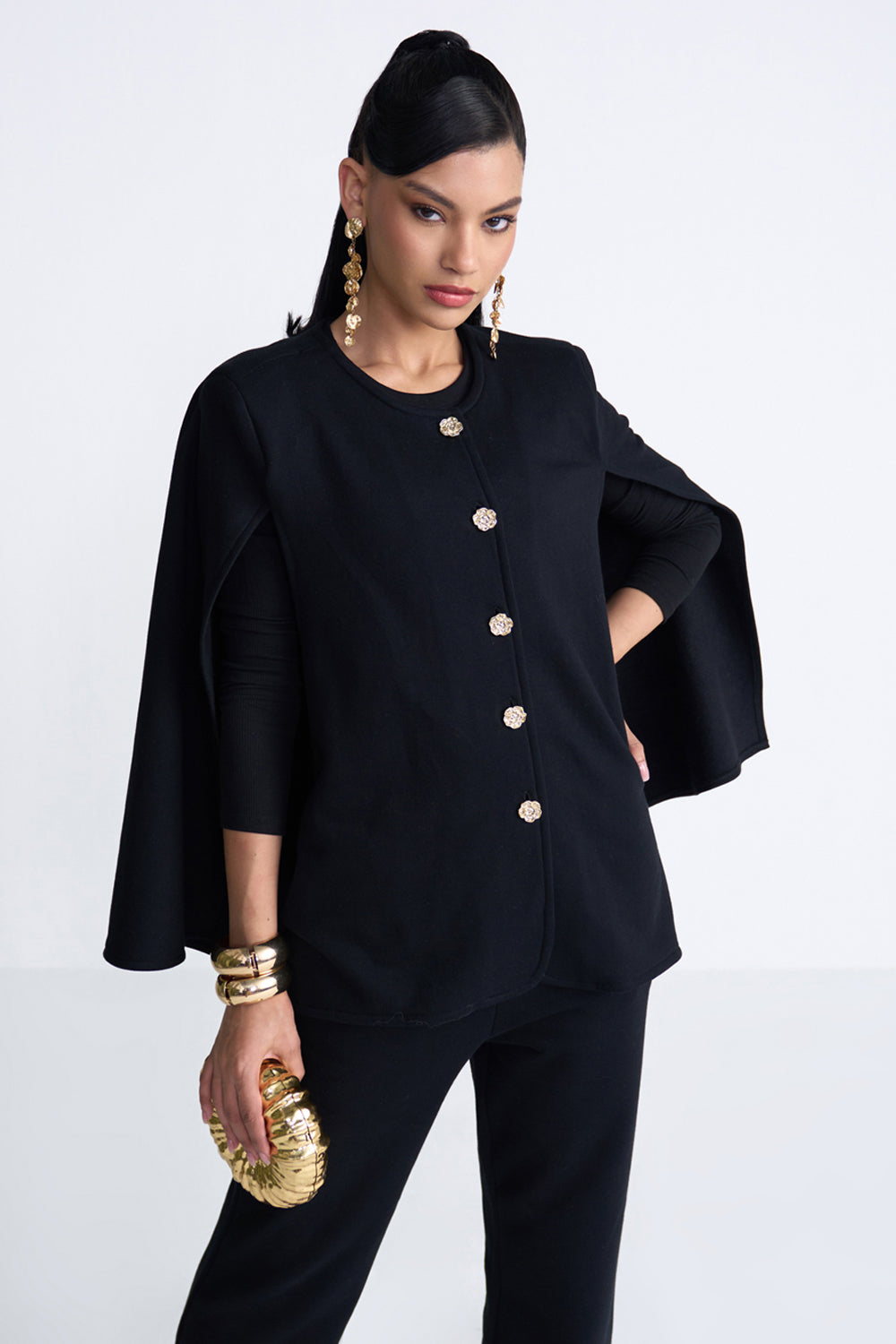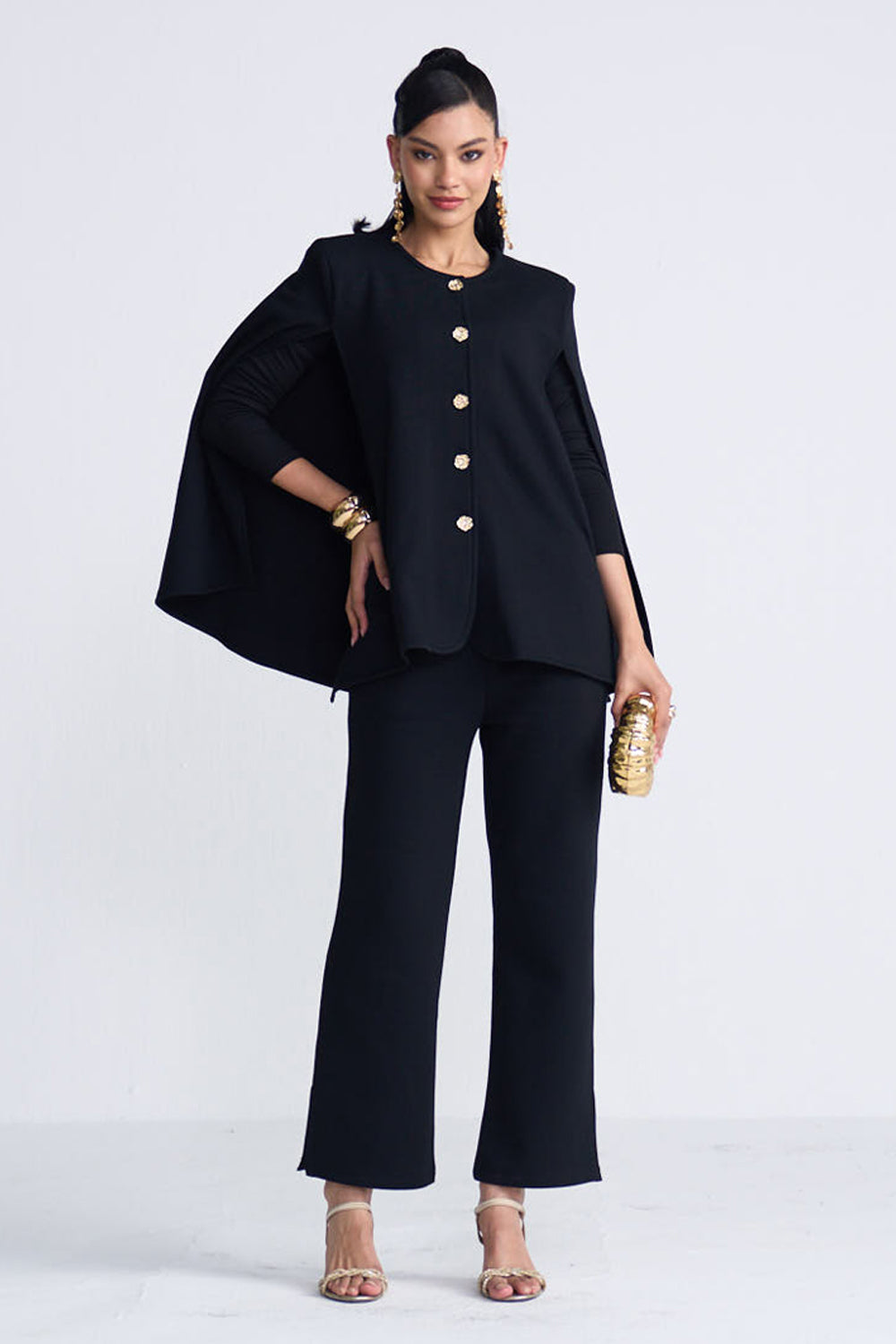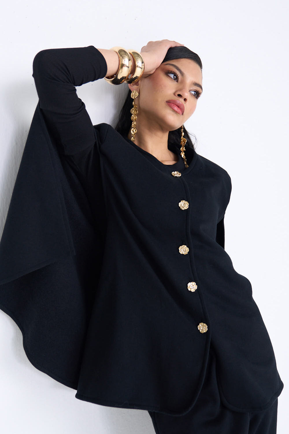 The Lumi set is an elegant, chic take on your daily winter loungewear. Made in the softest black fleece, our cape and pants set has luxurious gold buttons down the front to add that touch of sophistication.