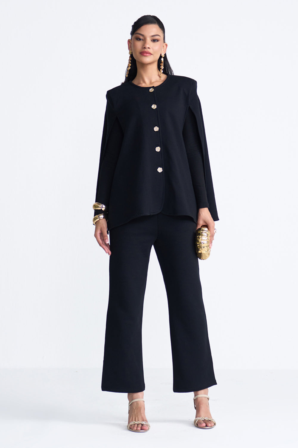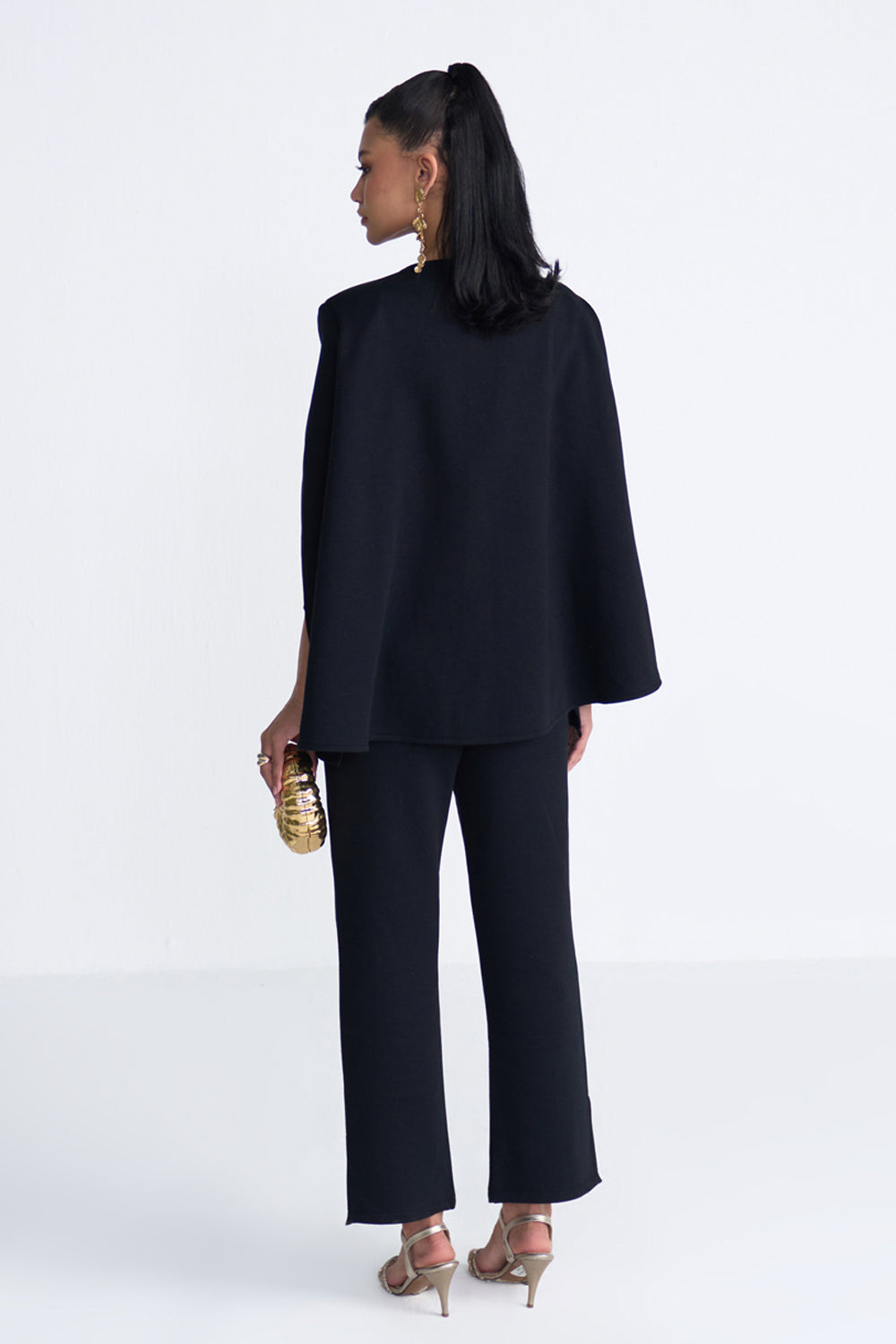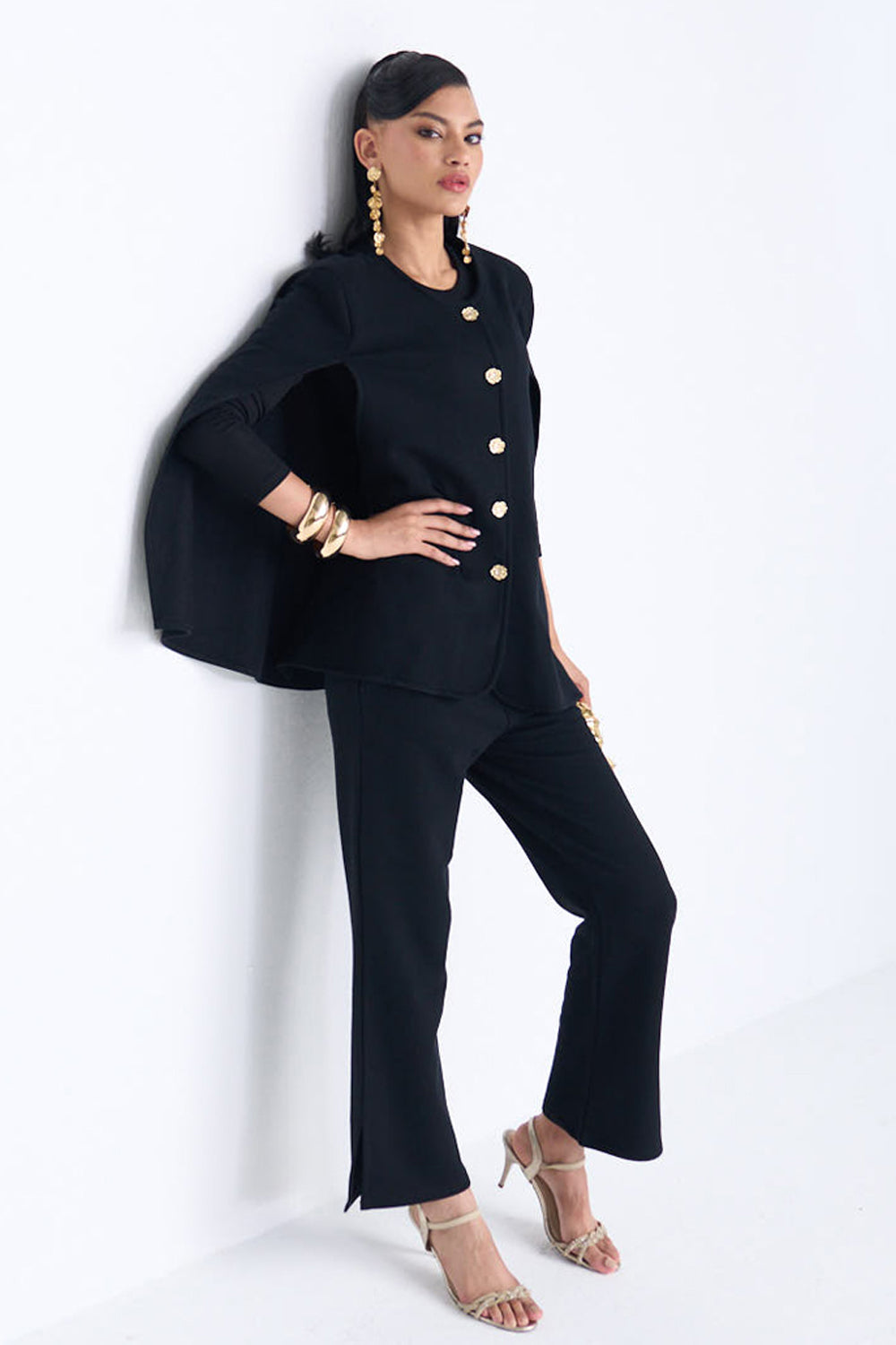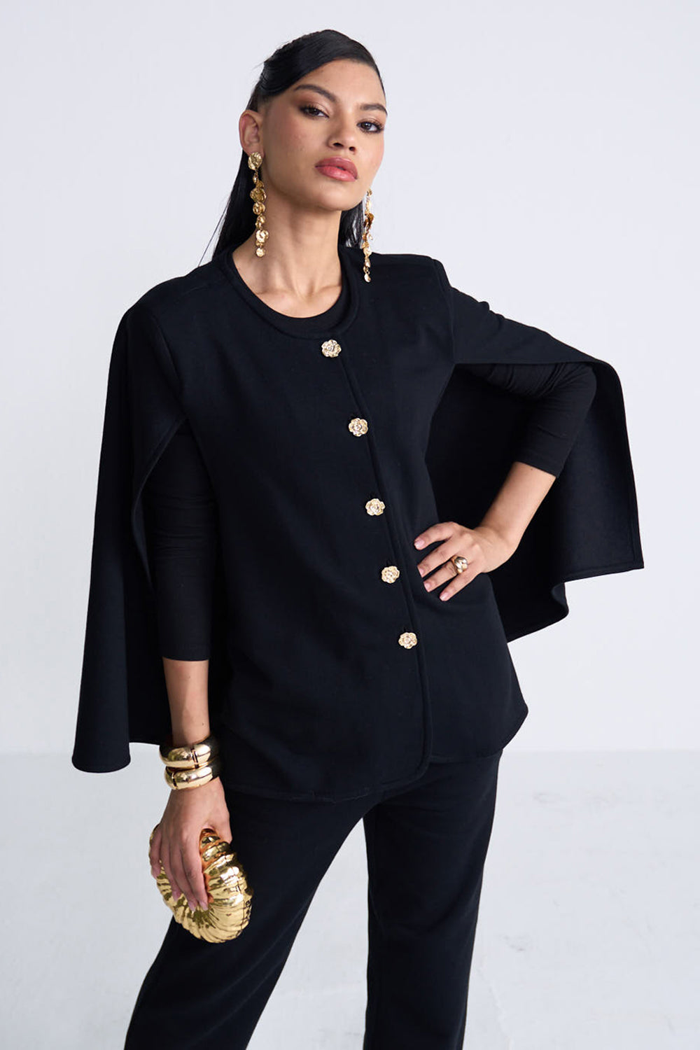 The Lumi set is an elegant, chic take on your daily winter loungewear. Made in the softest black fleece, our cape and pants set has luxurious gold buttons down the front to add that touch of sophistication.