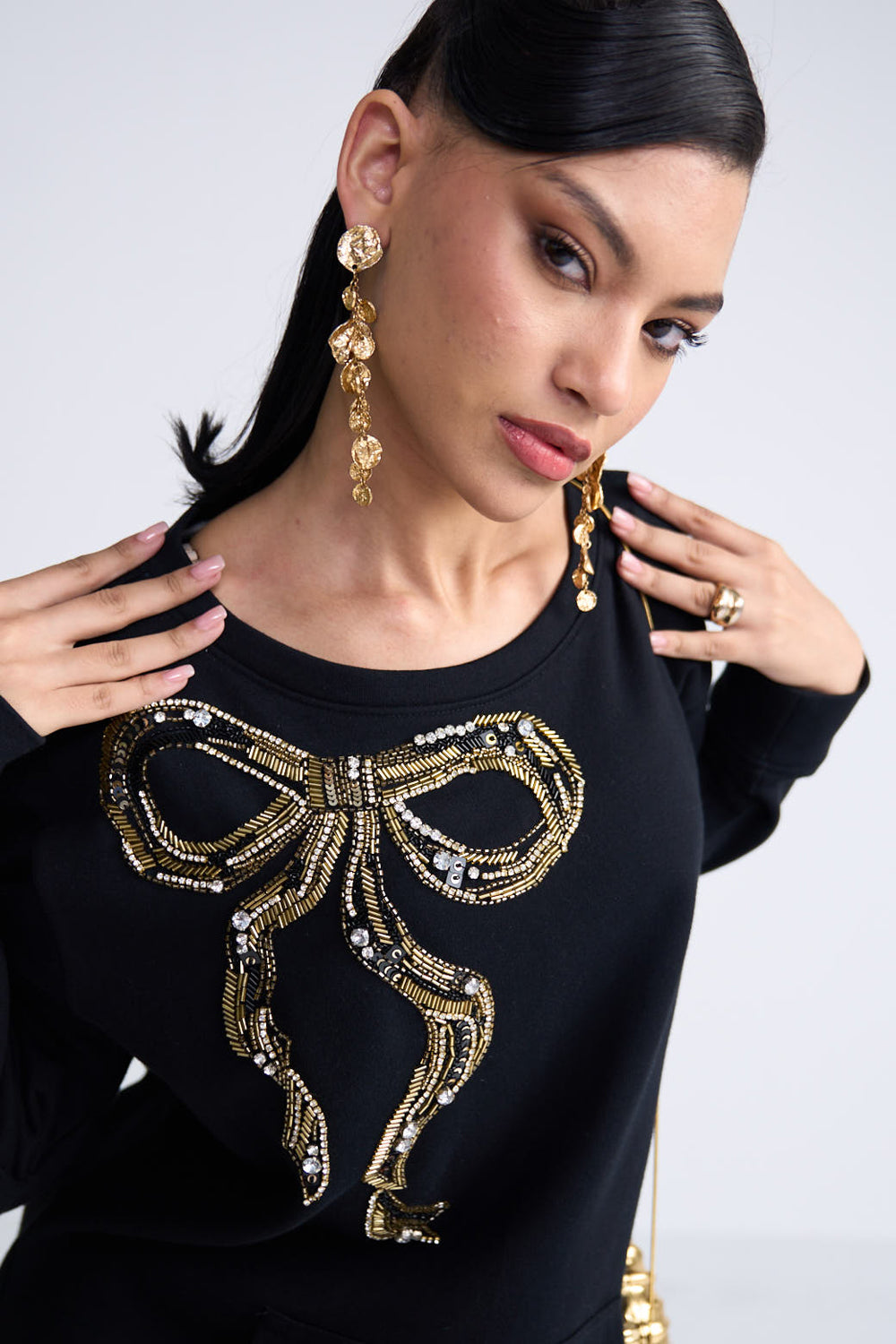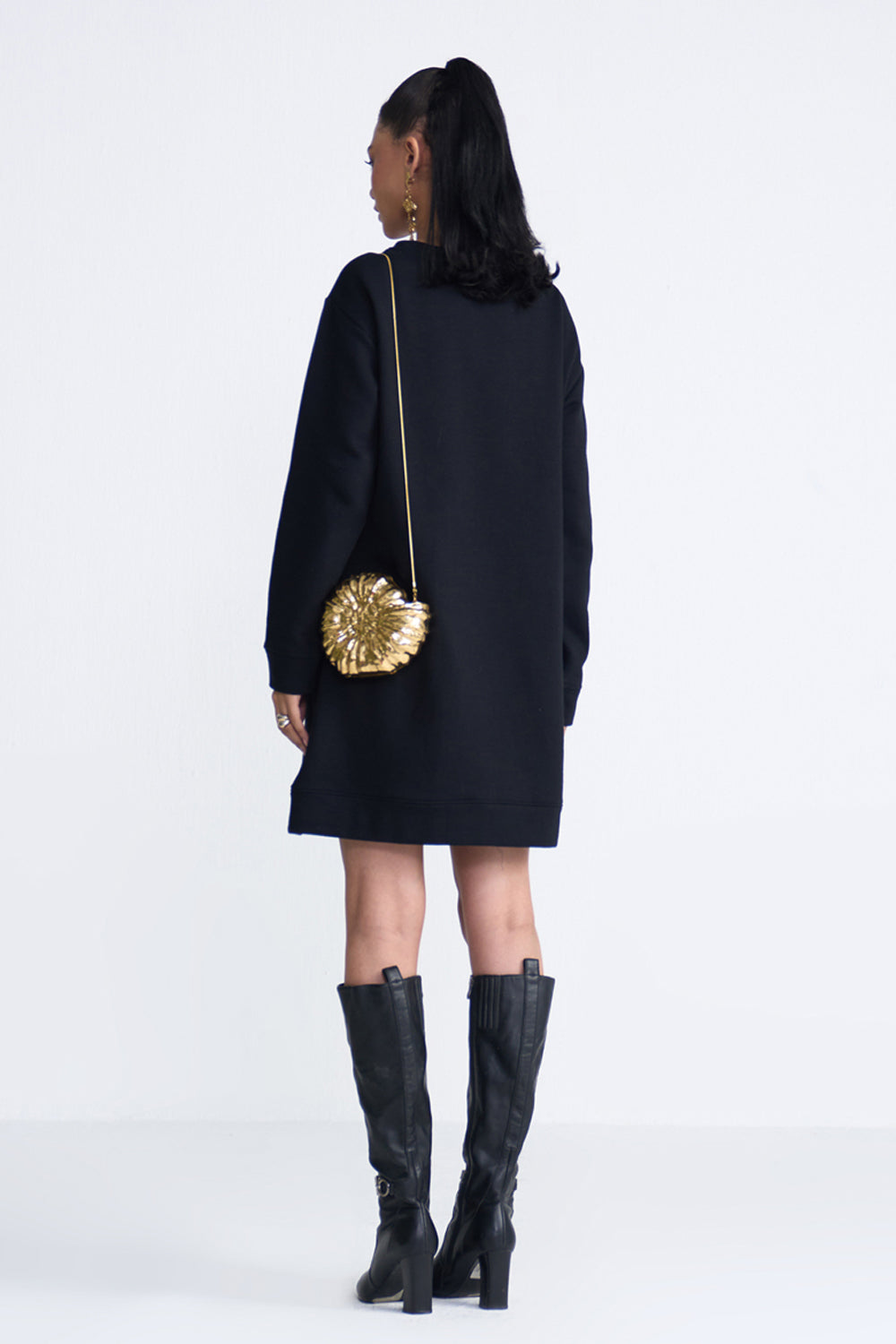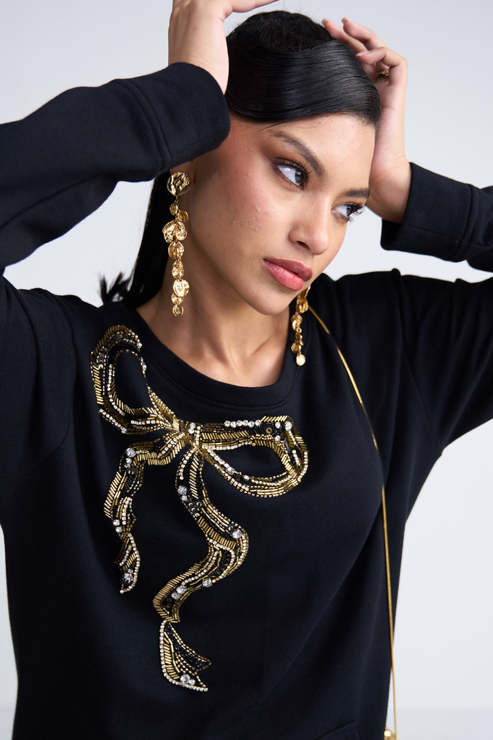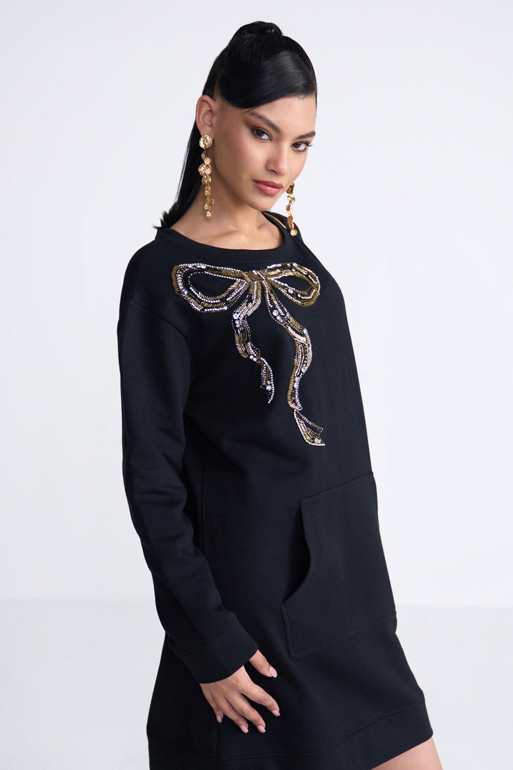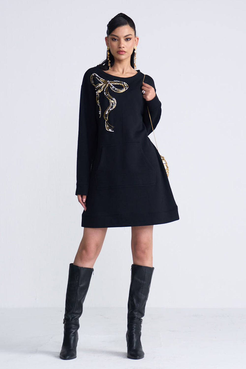 Cosy meets chic in this elegant black fleece dress, perfect for cooler days with a touch of sparkle. The embellished bow adds a touch of Sparkle to this holiday piece.