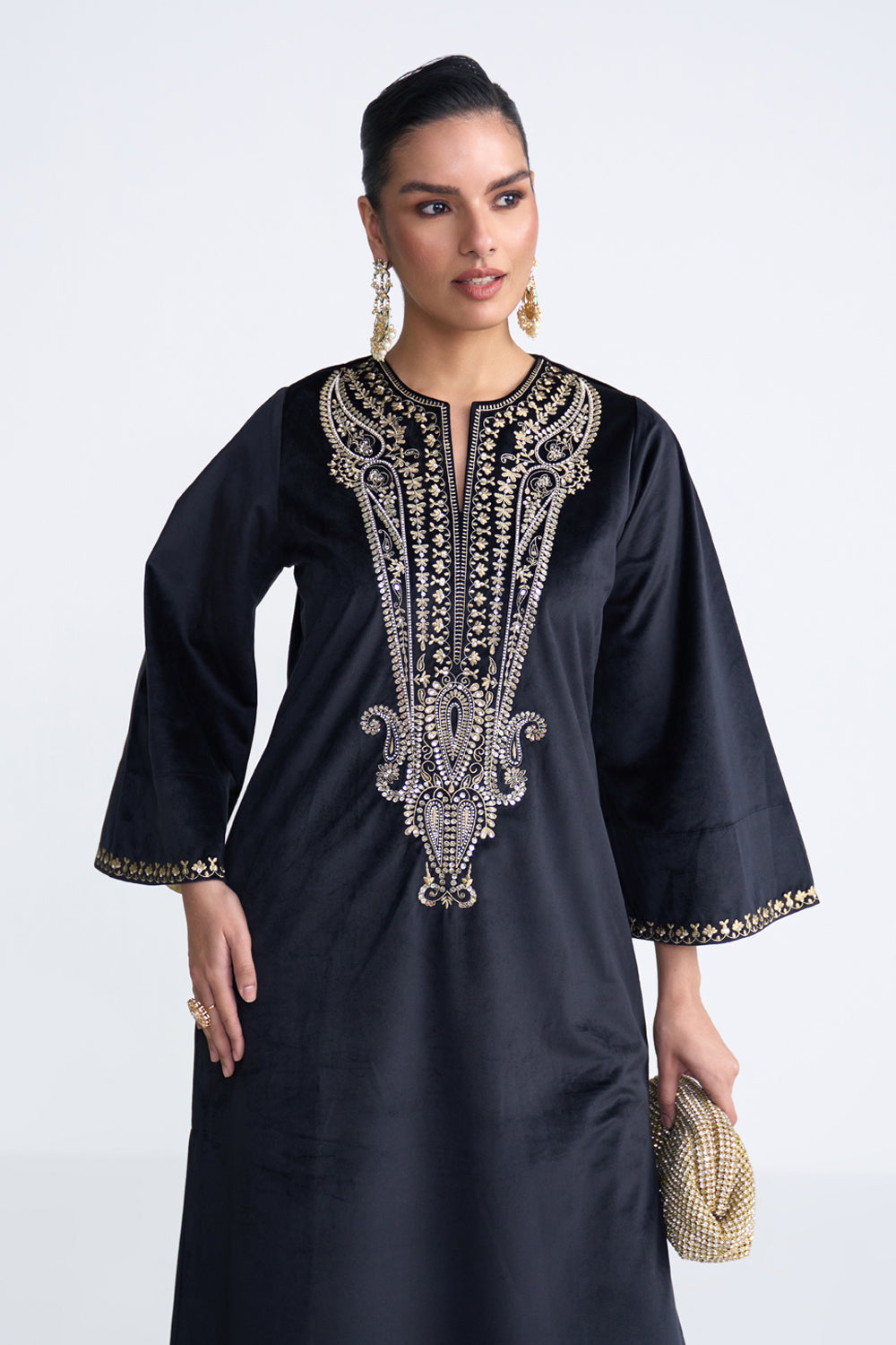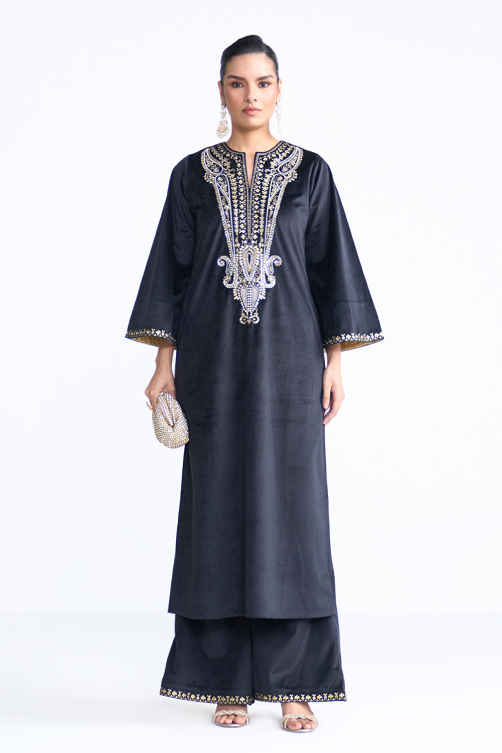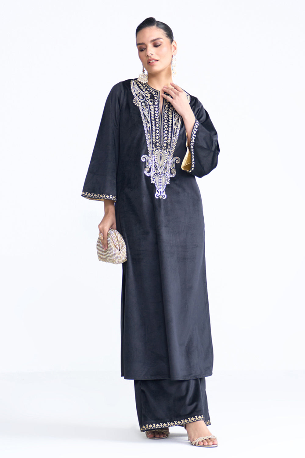 Featuring our cult fave, the nova kaftan set in denim now available in this luxurious black velvet. Get ready for your winter weddings with Sttavoss. The front of the kaftan has heavy embroidery and embellishment. Paired with pants of the same fabric, it will be your go to this party season.