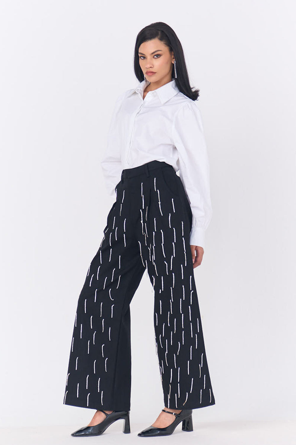 Black denim jeans with dazzling beadwork for a chic, high contrast sparkle.Own the room you walk into this season.