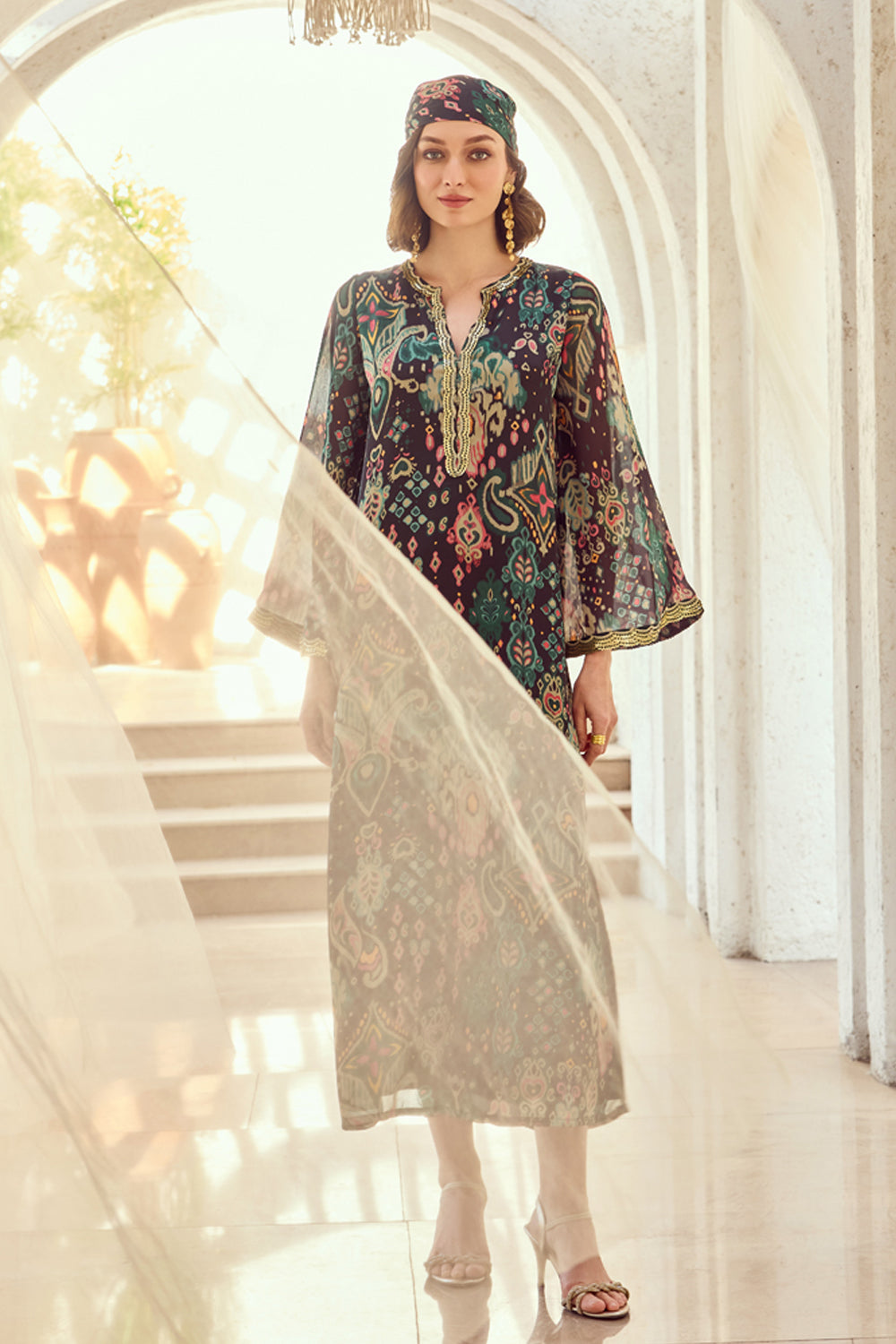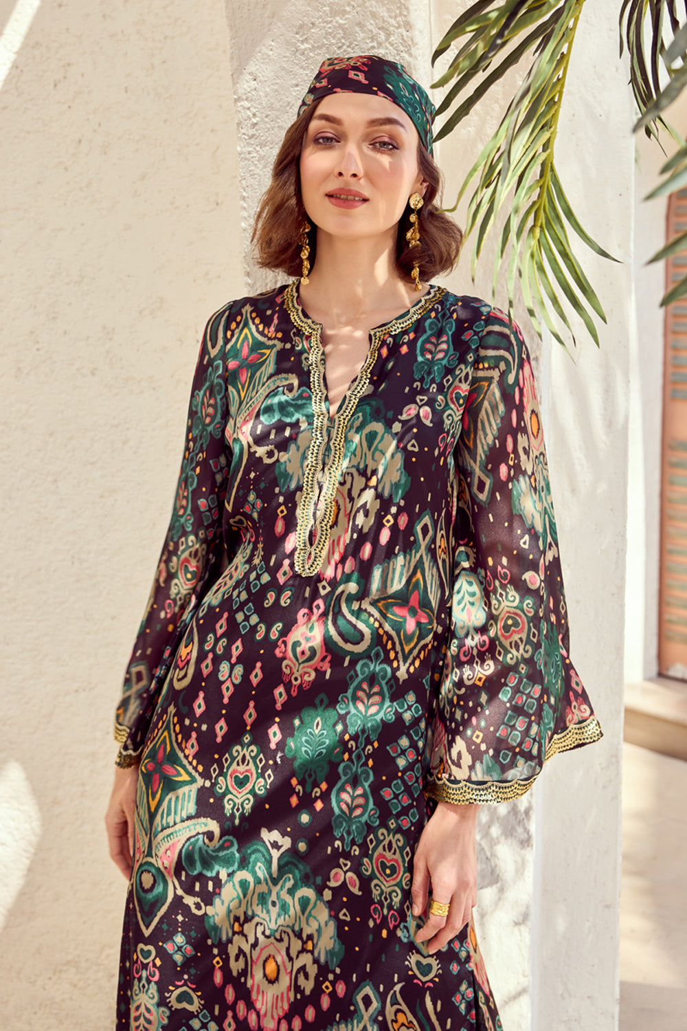 Get ready to turn heads in this show-stopping, emerald-green masterpiece. It features a vibrant print, flared full sleeves and a relaxed fit. Crafted from soft and breathable Rayon Slub fabric, this sava kaftan dress flows elegantly with every movement, creating a stunning silhouette.