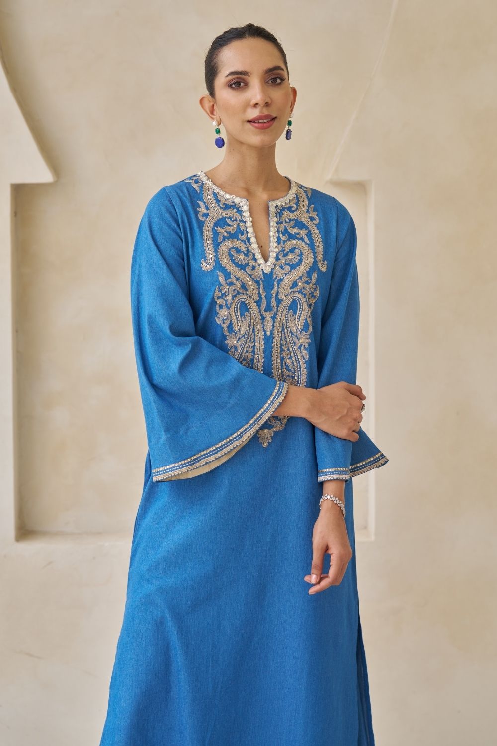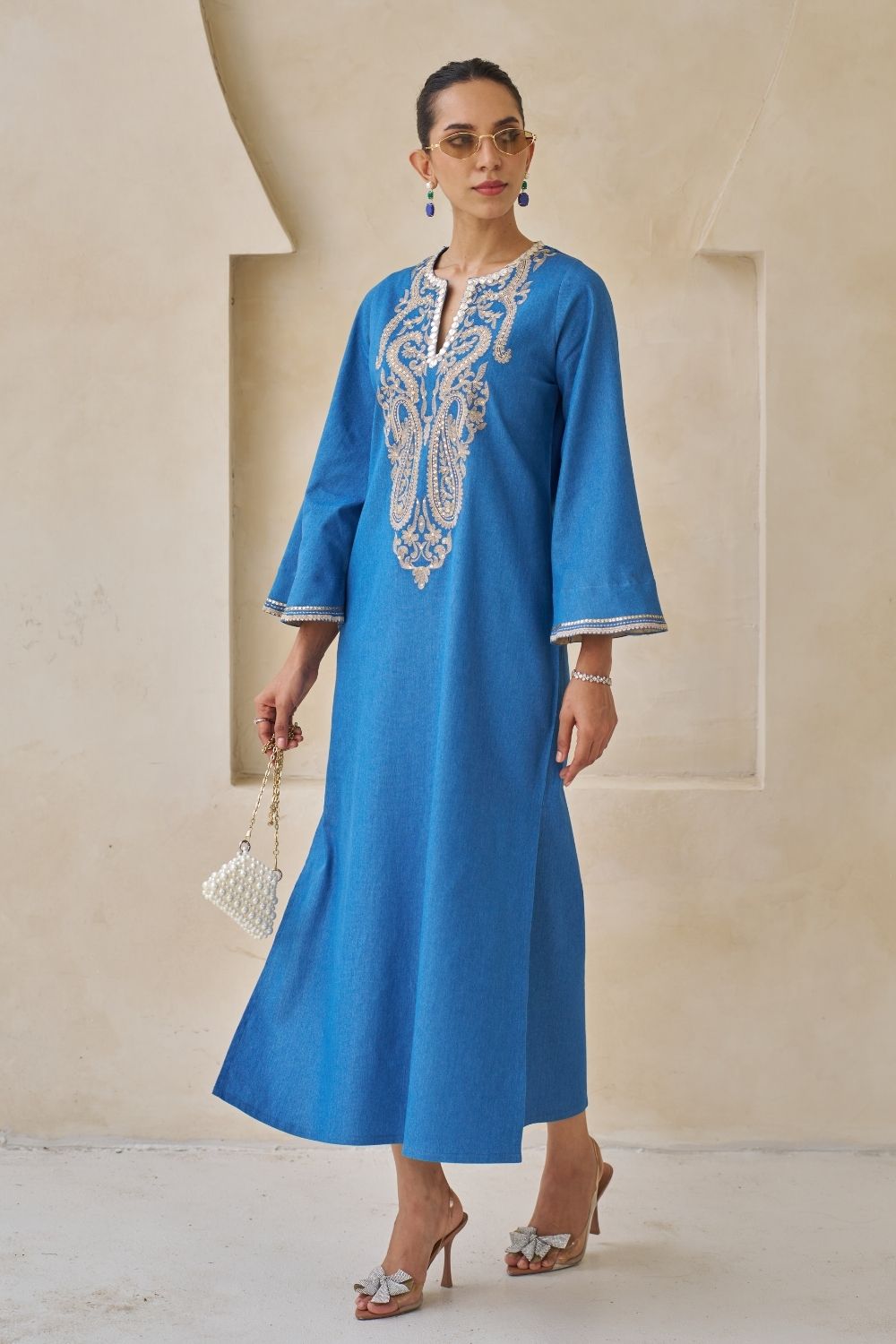 The Azura Kaftan features luxurious metallic thread embroidery and intricate handwork on the front and sleeves. This detailed craftsmanship highlights the elegance of the kaftan, making it an exceptional choice for sophisticated occasions. Combining rich textures with artisanal design, the Azura Kaftan delivers timeless style and refined charm.