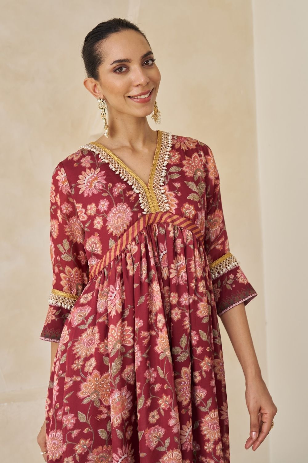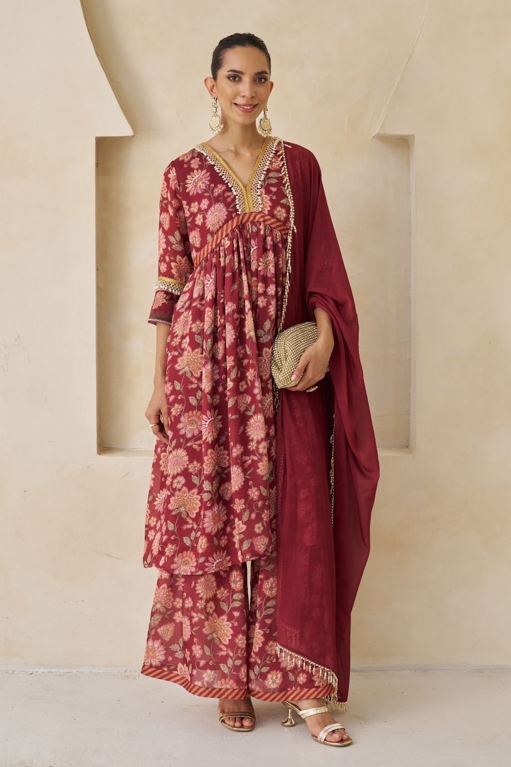 The Laya Three Piece Set with Dupatta features a flowing silhouette crafted in georgette satin with lining, showcasing heavy beadwork on the placket and sleeves. Its earthy tones and elegant detailing make it an effortlessly stylish and versatile choice for a refined look.