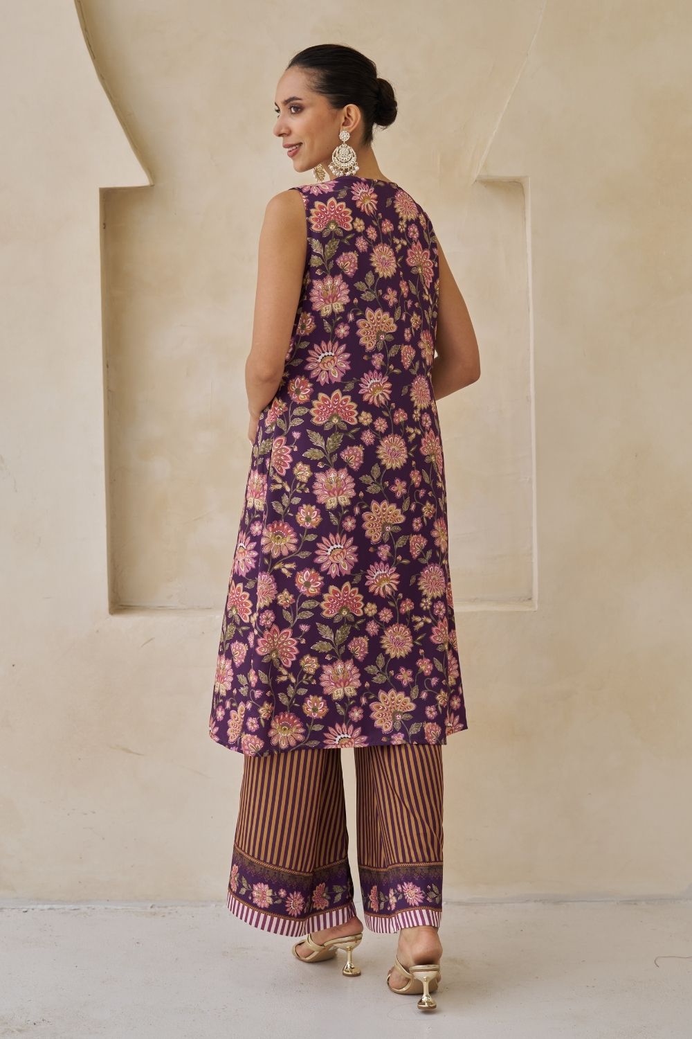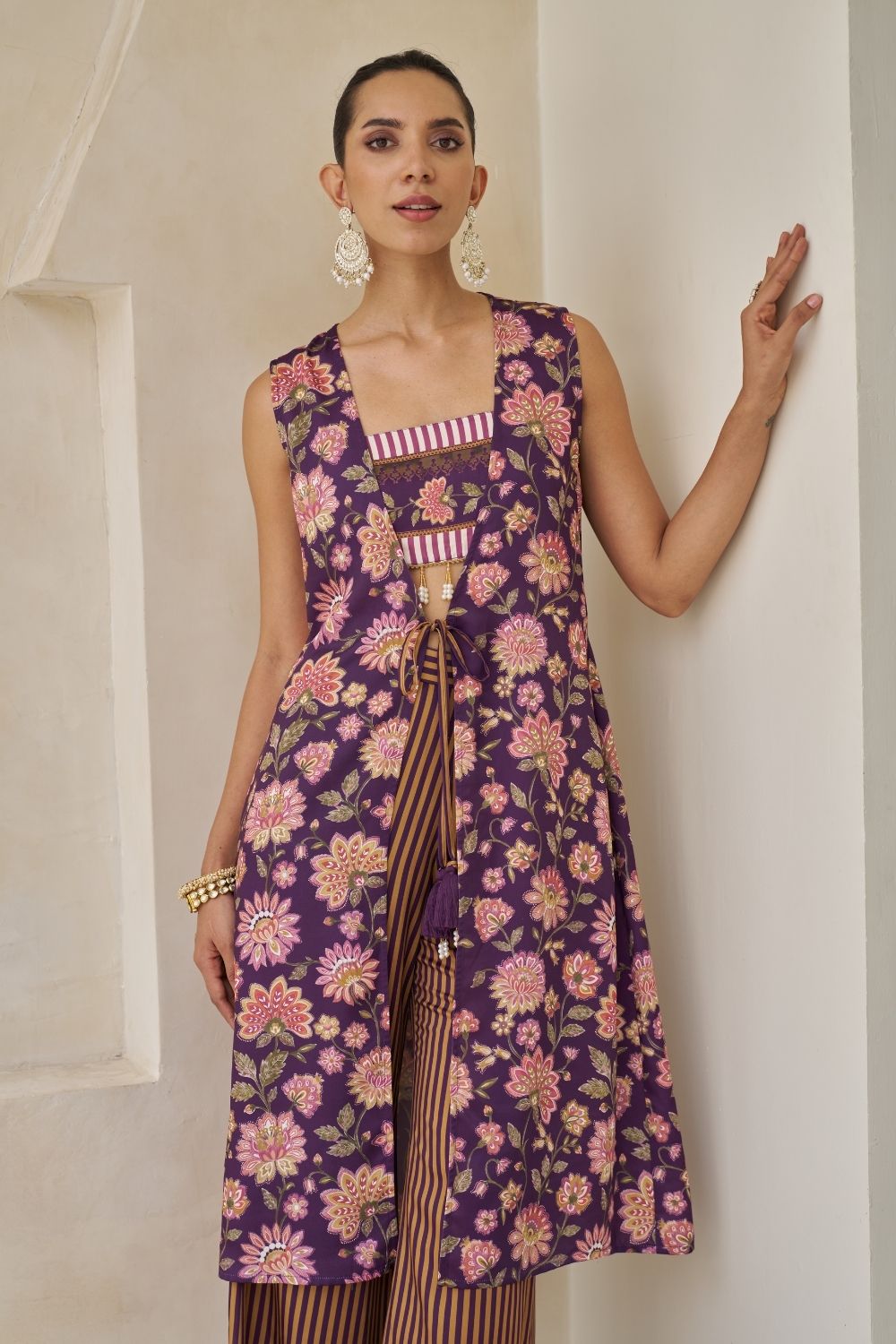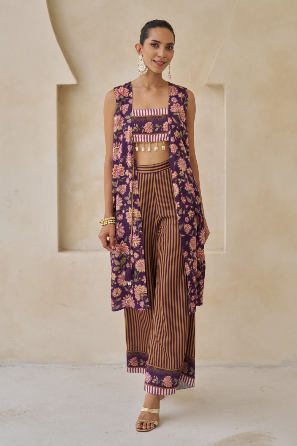 The Urvi Set is a sophisticated three-piece ensemble that highlights floral motifs paired with contrasting stripe pants for a striking look. It features a beautiful floral print border and a bustier detailed with latkan lace, delivering a thoughtful blend of individuality and expressive style. This versatile set is tailored for those who appreciate intricate design and comfortable elegance.