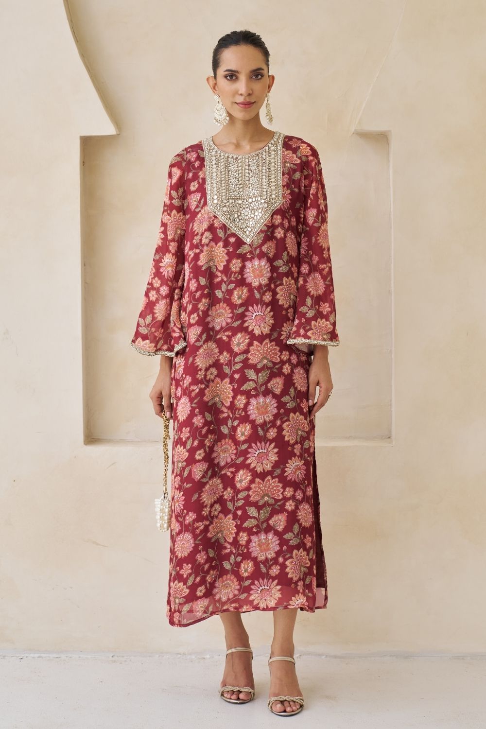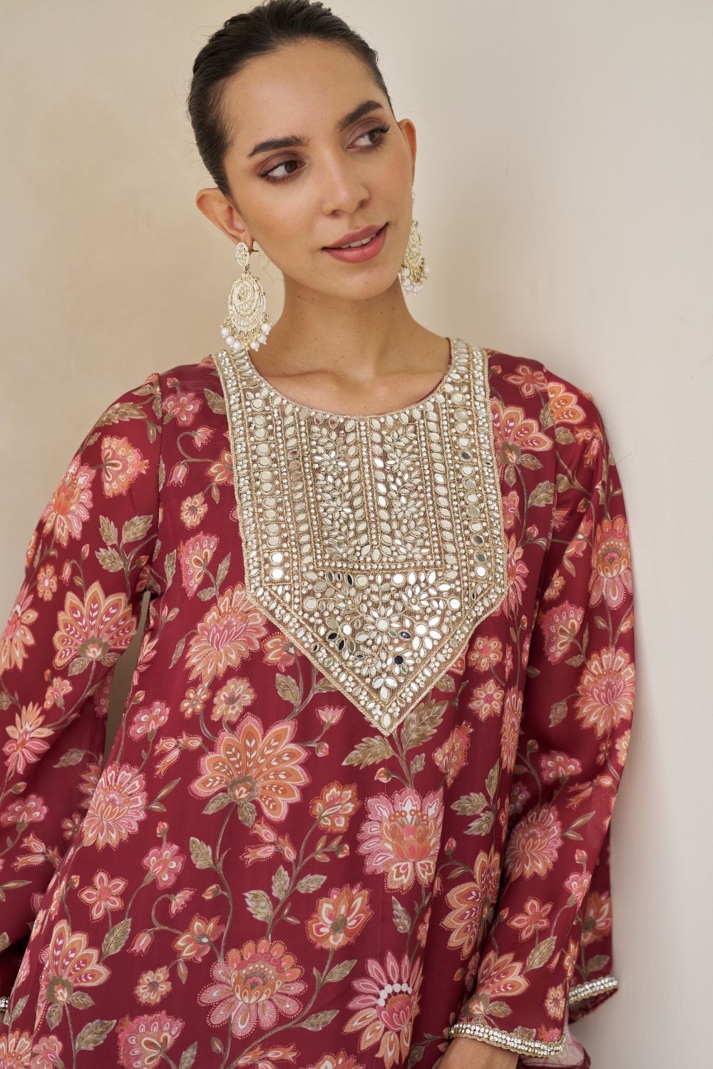Step into elegance with the Zarna Kaftan, crafted from luxurious georgette satin and fully lined for comfort. Its rich maroon print is elevated by intricate gold mirror work on the neck and sleeves, adding a refined festive touch. Lightweight and easy to wear, this kaftan combines vibrant style with sophisticated detailing, making it an exceptional choice for special occasions.