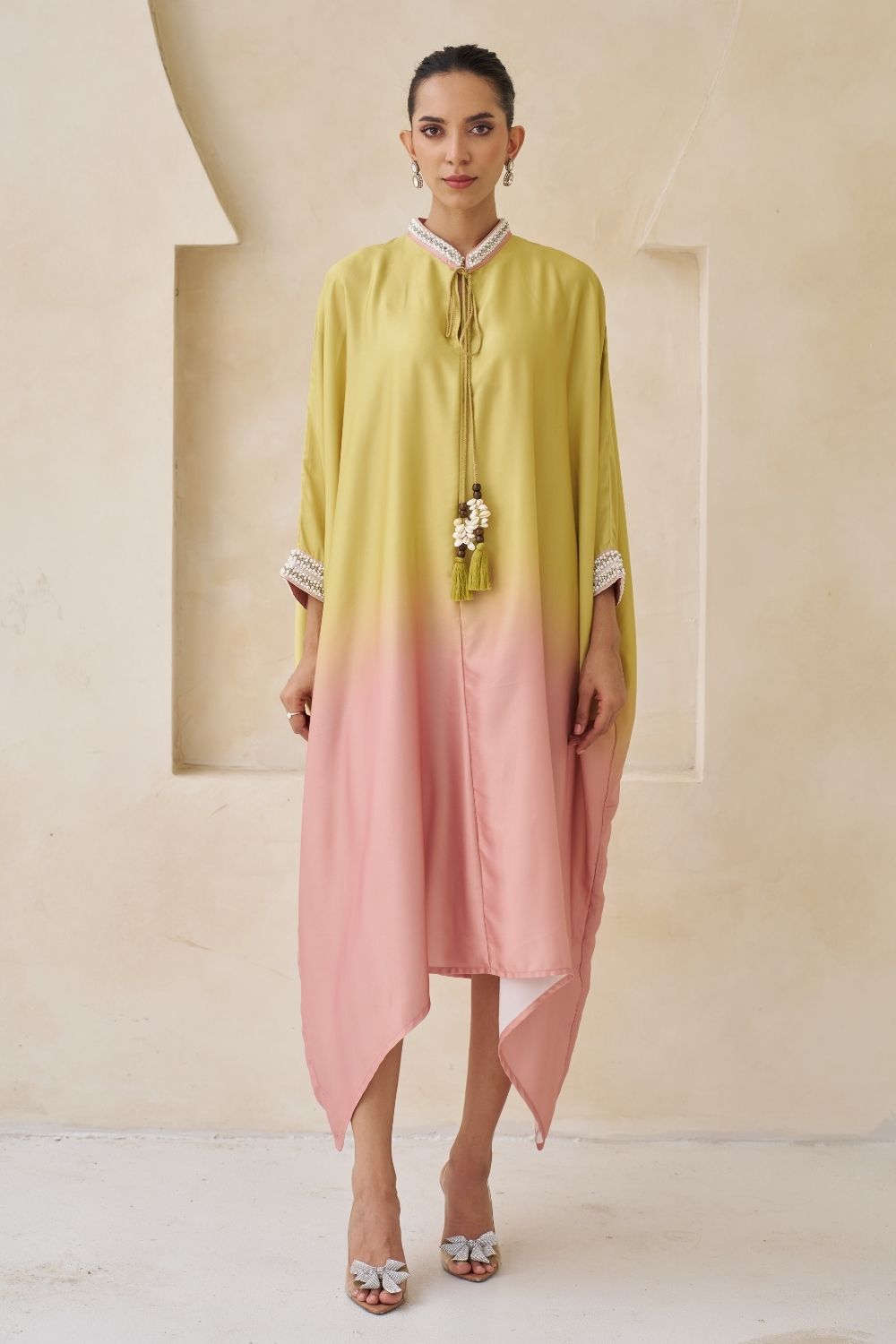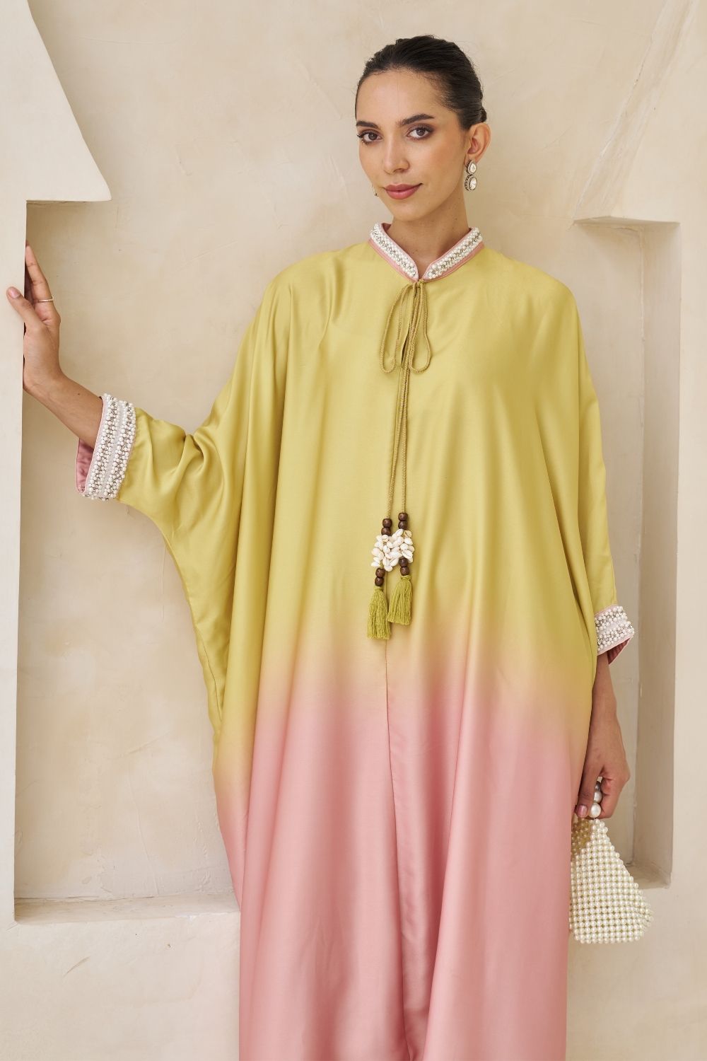 The Zinnia Kaftan showcases an elegant ombre design crafted from luxurious satin. Pearl detailing on the neckline and sleeves adds a refined touch, creating a stunning and sophisticated look. This kaftan blends comfort and opulence, making it perfect for special occasions or elevated daywear.