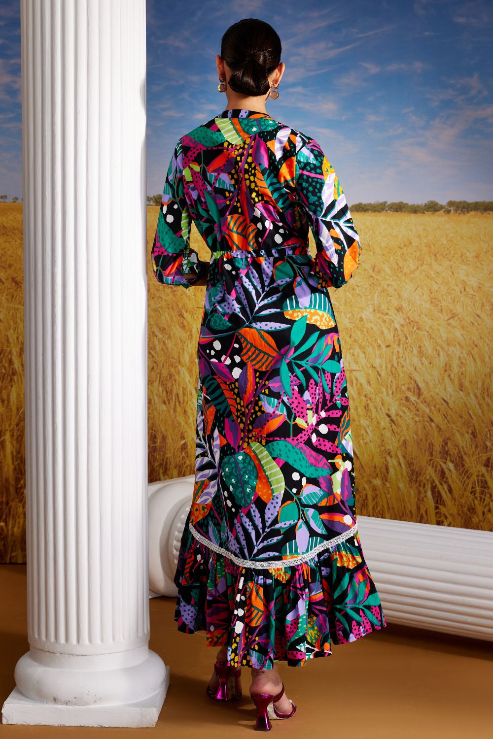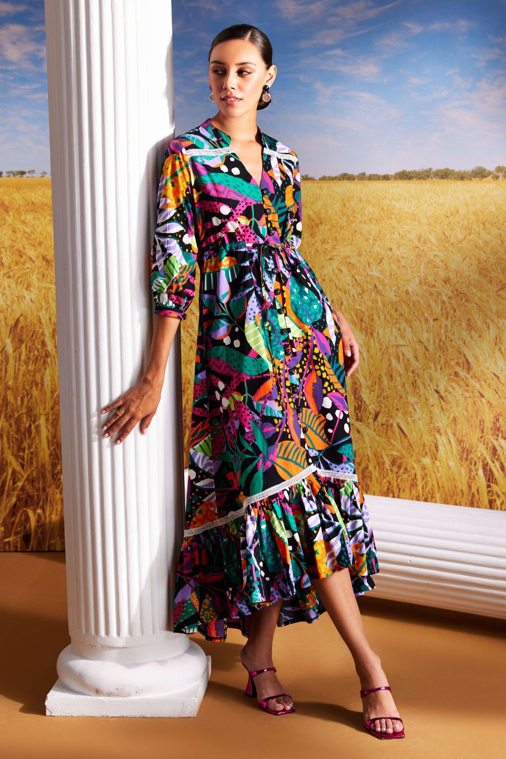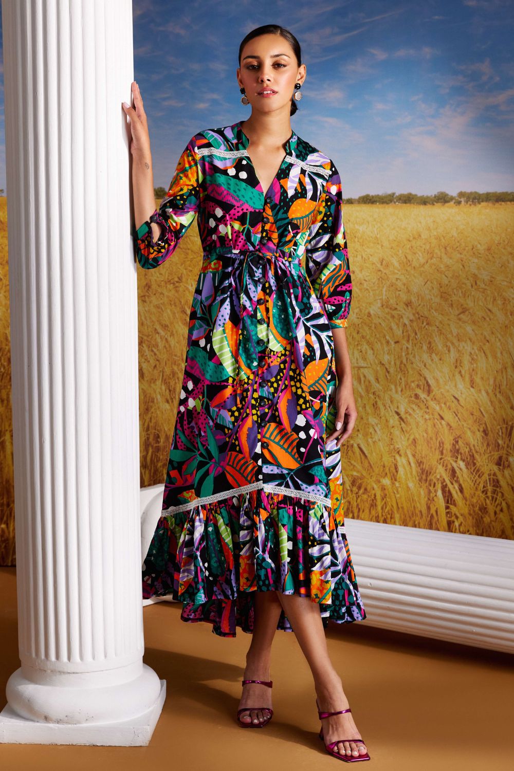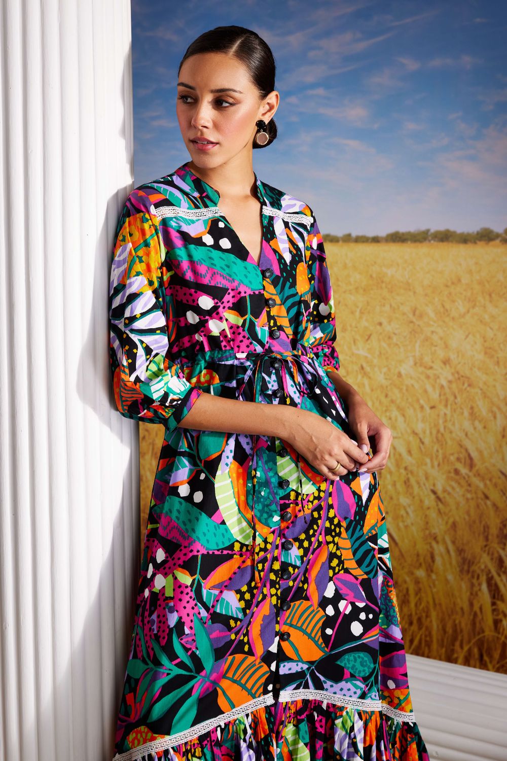 Maira maxi is here to slay all occasions for you. The front buttons and delicate waist tie up give way to a volumnous hemline with intricate lace. The print is unique and versatile.