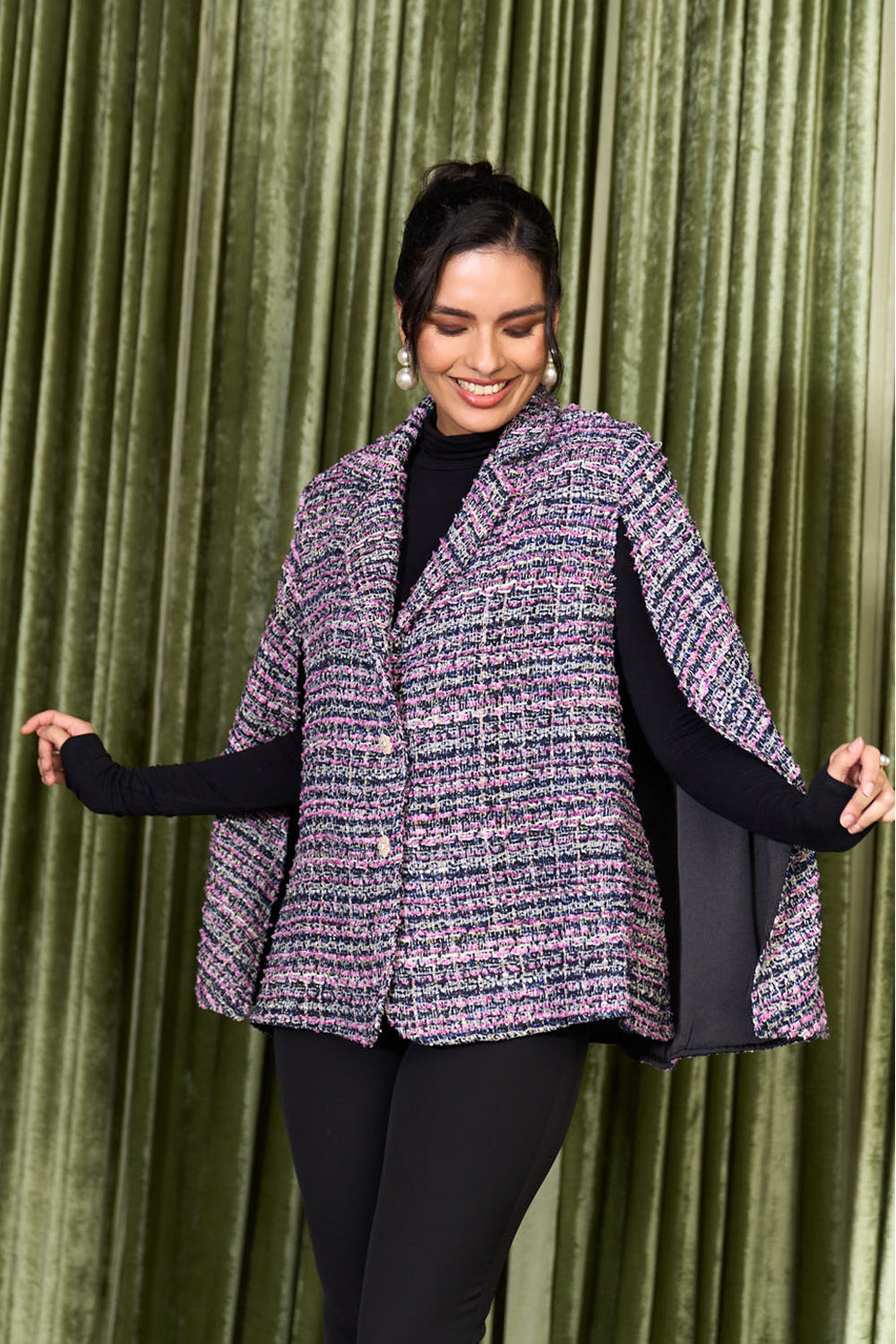 The Cerise cape in premium tweed has hues of deep pink and blue and floral buttons to accentuate its simple and chic vibe.