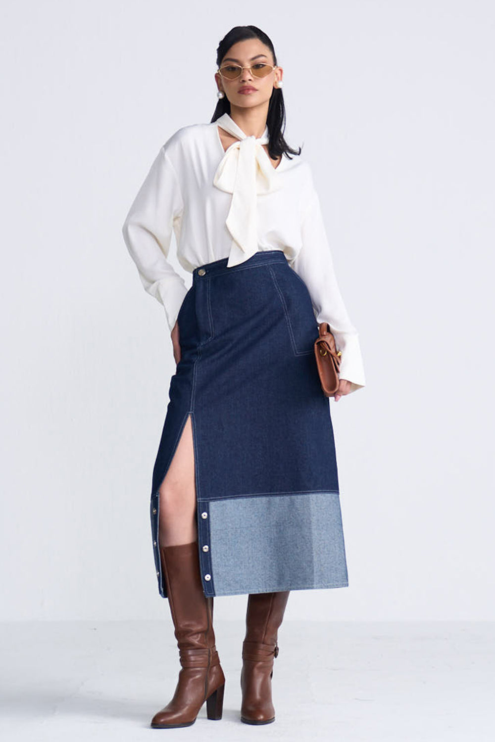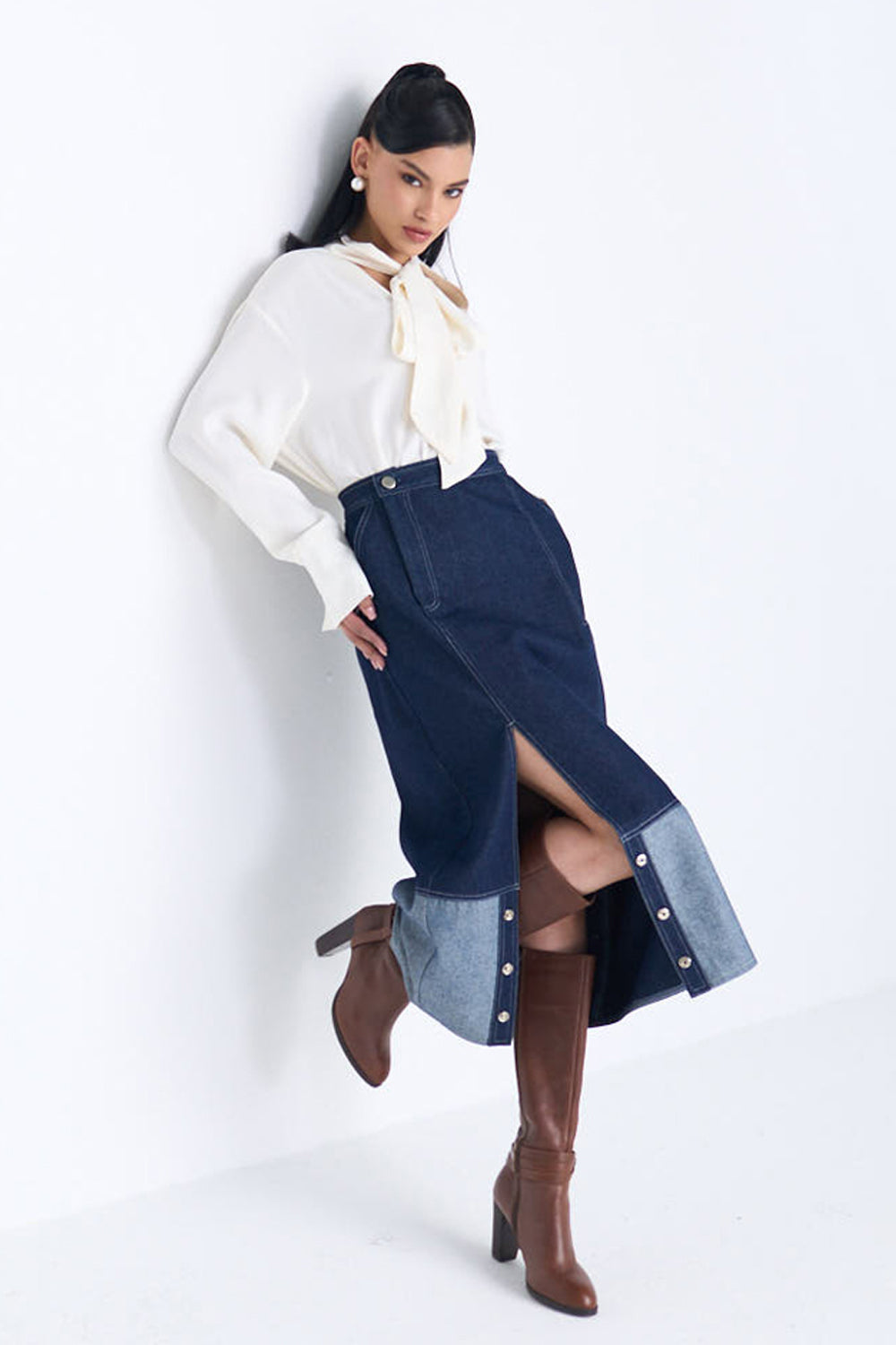 You love our skirts and we're here to give you more. Our newest denim skirt, rebel is your answer to what to pair up that white shirt with/ team up with a formal jacket/or dress down with a casual T.  With a fun metal buttons detailing down the front of the skirt- its a one in all!
