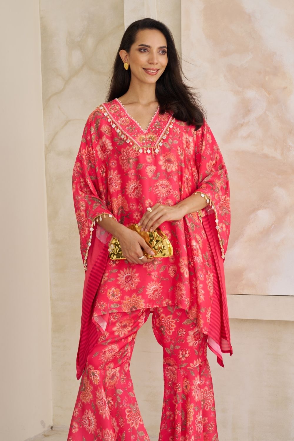 The Mahi Kurta Set offers a feminine and flattering silhouette with its flowy design. This ensemble pairs a beautifully embellished kurta featuring intricate beadwork and delicate lace on the neckline with a coordinating sharara, making it a stylish and graceful choice for festive occasions.