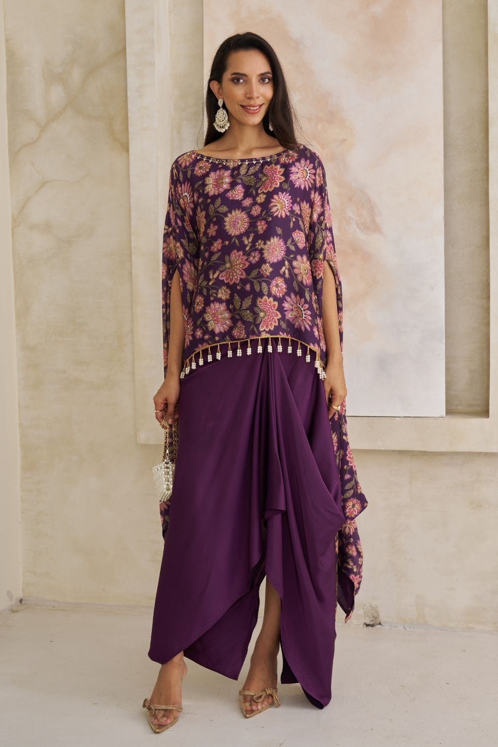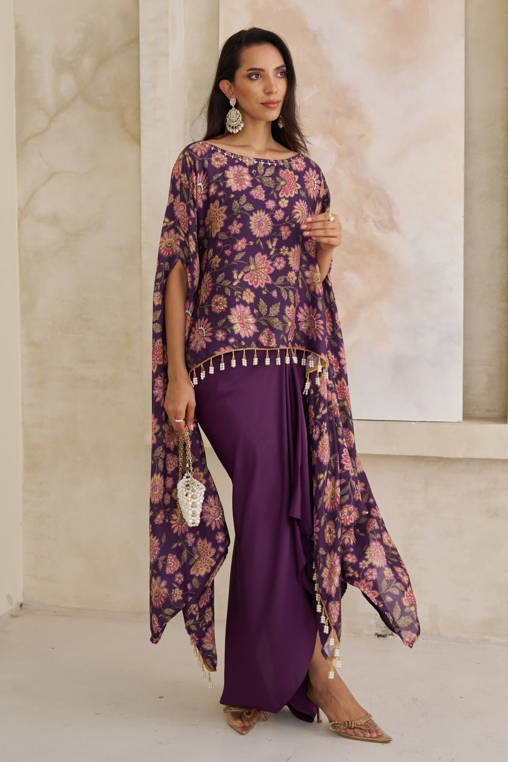 The Nahar Skirt Set features a refined two-piece design with a skirt and a cape detailed by delicate beadwork along its edges. This subtle embellishment adds texture and sophistication, making it an elegant choice for special occasions.