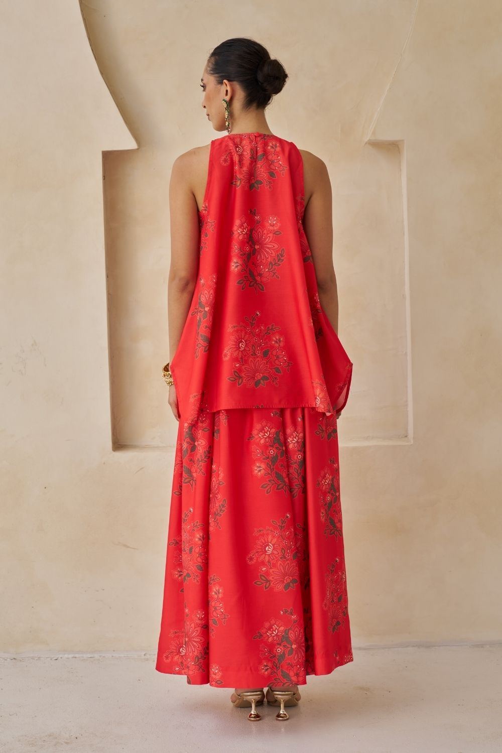 The Sakhi Lehenga Set is a three-piece ensemble crafted in luxurious Chanderi fabric, featuring a bustier, flowing skirt, and dupatta. Embellished with intricate handwork on the neckline, it combines delicate floral motifs with modern elegance, creating a feminine and unforgettable look perfect for special occasions.