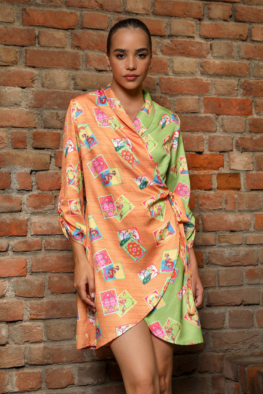 Dance through the day in our khadi rayon overlap dress, featuring striking color blocking and an all-over print that celebrates creativity and vibrant design.