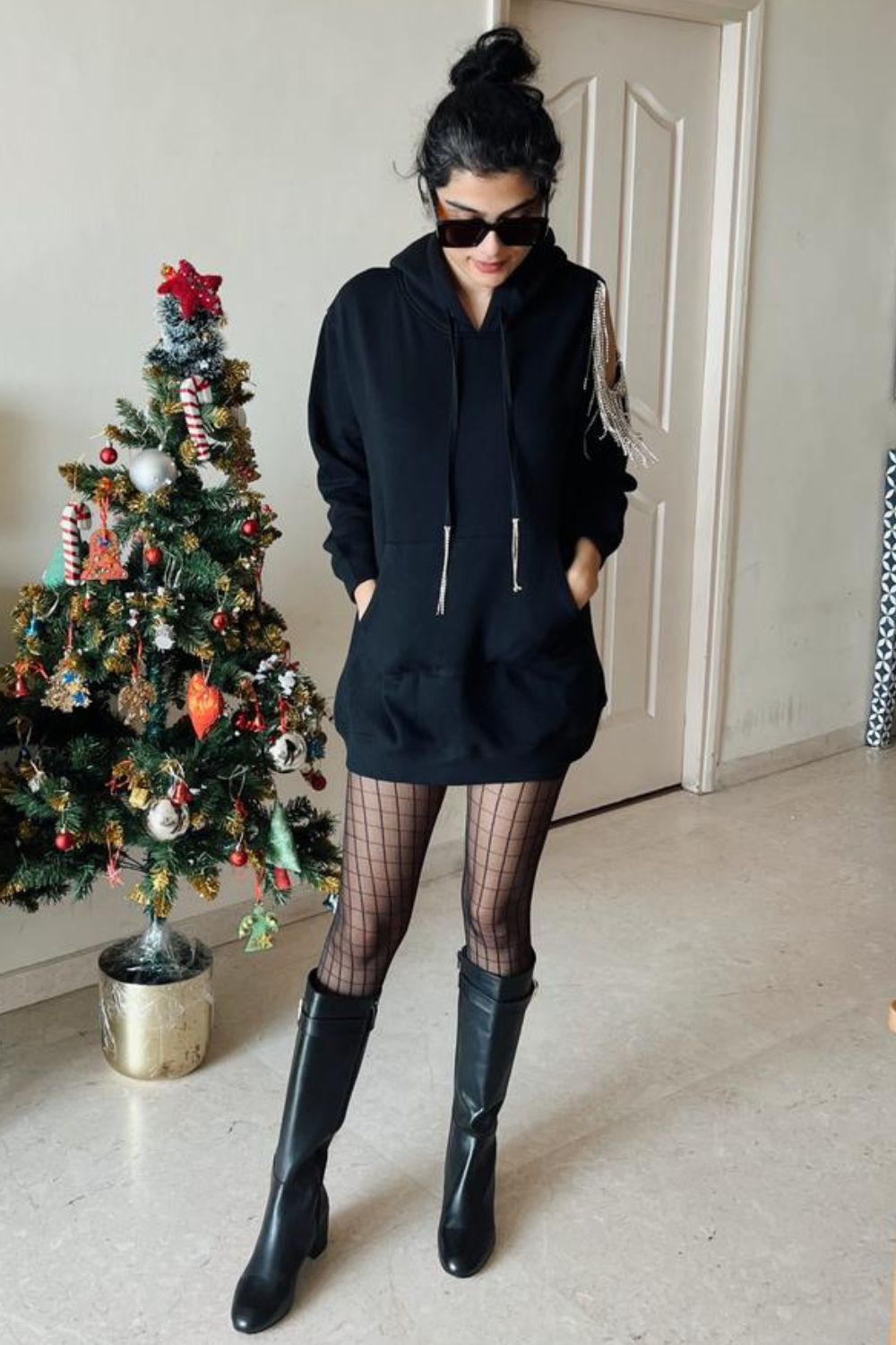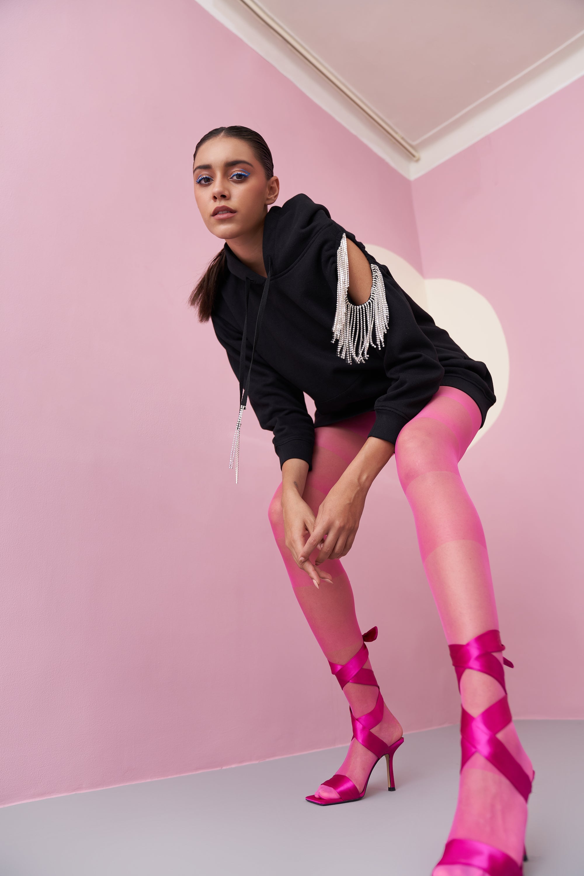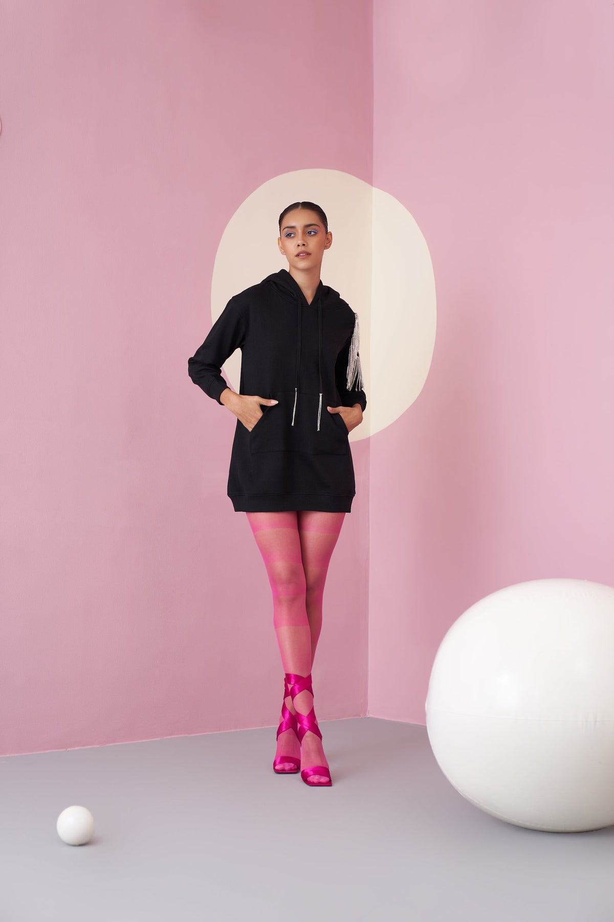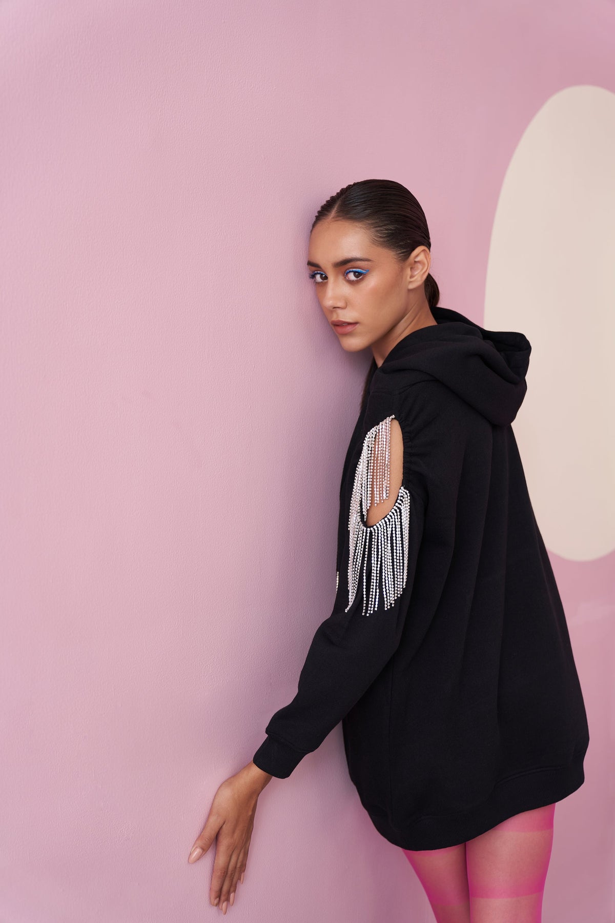 The Iconic Hoodie everyone wants their hands on! Made with the best quality cotton fleece. Cold shoulder on left side lined with crystal stone fringes all over.
