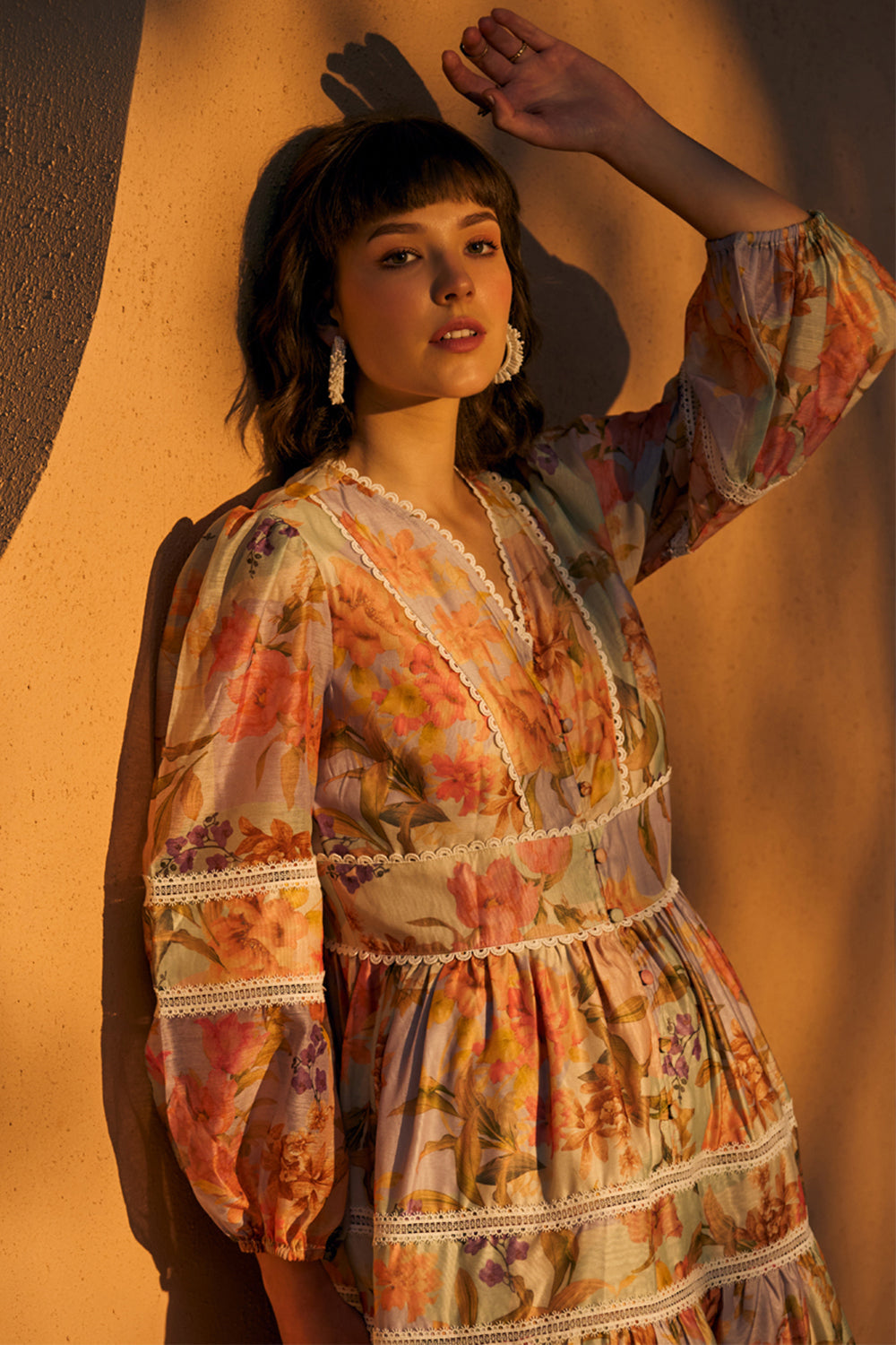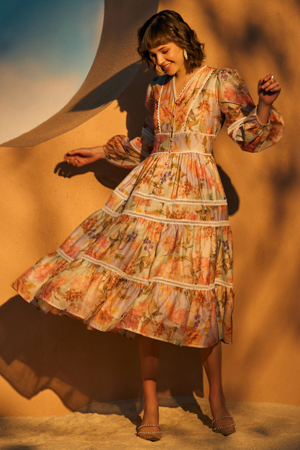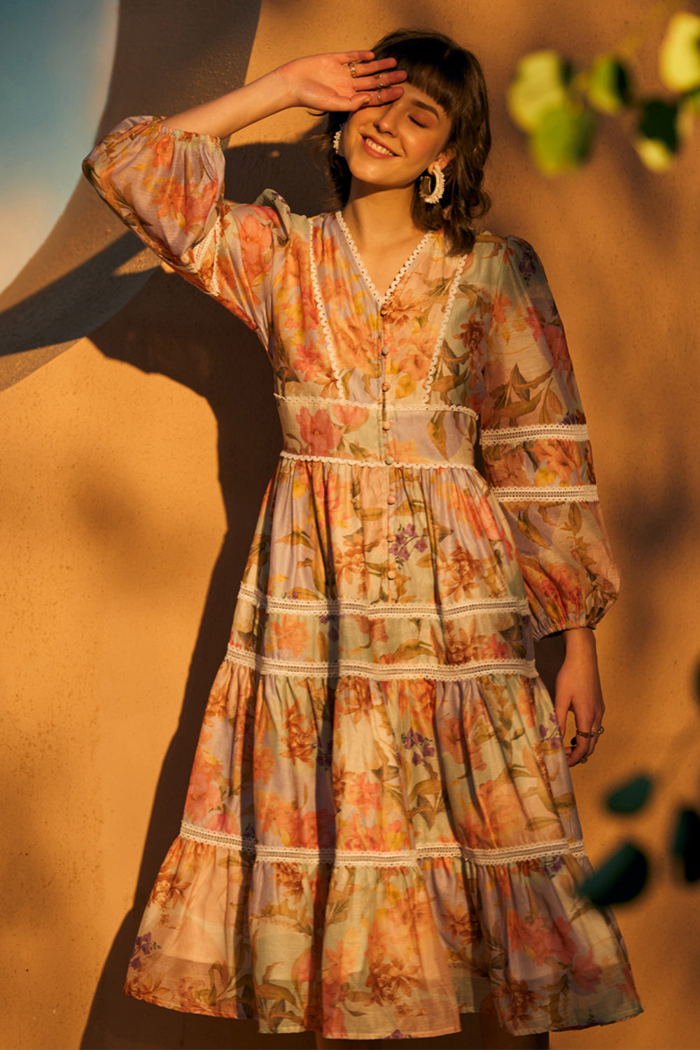 Wander down the garden path in our gorgeous Tulum print midi dress.The silhouette of the dress has perfectly placed insert laces and layers of our gorgeous print to create romantic volume.